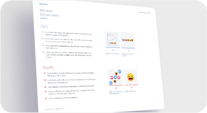 Brand Assets Facebook Brand Guidelines Reactions— Do’s and Don’ts Do’s % Do use Reactions only as they appear and similar to how they function within the context of Facebook UI. % Do use Reactions as one collection: Like, Love, Haha, Wow, Sad, Angry. Do not use Reactions as individual icons. 3 % Do use relevant messaging and as a full collection if shown outside of the Facebook UI. % % When using Reactions within a Facebook user interface, follow the Do use provided templates. Do always use the complete User Interface guidelines available on the Facebook Brand Resource collection. Center. Don’ts - Don’t modify or customize Reactions in any way, such as by changing the design, scale or colors. z z - Don’t break up the collection of Reactions and prioritize or feature any z Reactions as individual icons. - Don’t animate or fabricate physical objects in the form of Reactions. - Don’t use alternate or customized Reactions as a replacement or an - - addition to the collection of Reactions. Don’t not show a Reactions Don’t modify Reactions. as an incomplete set. - Don’t use Reactions for creative purposes. Facebook Inc. - All rights reserved. 21