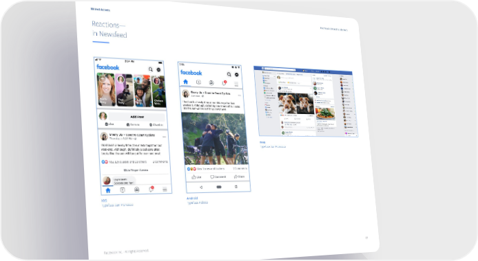 Facebook Brand Book Page 18 Page 20Brand Assets Facebook Brand Guidelines Reactions— in Newsfeed Web Typeface: San Francisco iOS Android Typeface: San Francisco Typeface: Roboto Facebook Inc. - All rights reserved. 19