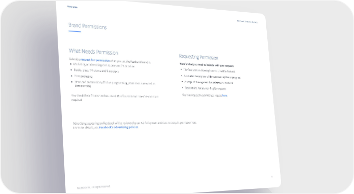 Welcome Facebook Brand Guidelines Brand Permissions What Needs Permission Requesting Permission Submit a request for permission when you use the Facebook brand in: Here’s what you need to include with your request: • Marketing or advertising that appears on TV or online y The final version showing how the UI will be featured • Books, plays, TV shows and film scripts y A detailed description of the commercial, film or program • Print packaging y A script of the segment that references Facebook • News and commentary (for live programming, permission is required as time permits) y Translations for any non-English requests You should hear from us within a week. Plan for additional time if revisions are You may request by submitting a request here. required. Advertising appearing on Facebook will be reviewed by our Ad Policy team and does not require permission here. For more details, visit Facebook’s advertising policies. Facebook Inc. - All rights reserved. 8
