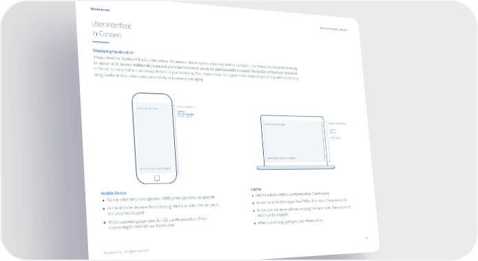 Brand Assets Facebook Brand Guidelines User Interface in Context Displaying Facebook UI Always show the Facebook UI within the context of a relevant device, such as a mobile phone or computer. The UI must not be shown hovering on-screen or on its own. Additionally, icons and elements from the UI cannot be used separately or outside the context of Facebook. Facebook UI should be presented as a secondary element in your marketing. Your content must not appear to be created in partnership with Facebook by using Facebook UI or other assets prominently or as primary messaging.. Screen ≤ 100% file size Do not crop top or sides. Typeface: iOS – San Francisco Android – Roboto Screen ≤ 100% file size Do not crop top or sides. Typeface: Helvetica 15 inch laptop Bottom of screen can be cropped. Bottom of screen can be cropped. Mobile Device Laptop • Do not resize the UI to larger than 100% of the size of the provided file. • Use the available Web UI combined with a 15-inch laptop. • Fit the UI to the device without cropping the top or sides. The bottom of • Do not resize the UI to larger than 100% of the size of the provided file. the UI can be cropped. • Fit the UI to the device without cropping the top or sides. The bottom of • When customizing type layers for iOS, use Helvetica font. When the UI can be cropped. customizing for Android, use Roboto font. • When customizing type layers, use Helvetica font. Facebook Inc. - All rights reserved. 24