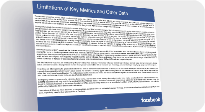 Limitations of Key Metrics and Other Data The numbers for our key metrics, which include our daily active users (DAUs), monthly active users (MAUs), and average revenue per user (ARPU), are calculated using internal company data based on the activity of user accounts. While these numbers are based on what we believe to be reasonable estimates of our user base for the applicable period of measurement, there are inherent challenges in measuring usage of our products across large online and mobile populations around the world. In addition, we are continually seeking to improve our estimates of our user base, and such estimates may change due to improvements or changes in our methodology. Weregularly evaluate these metrics to estimate the number of "duplicate" and "false" accounts among our MAUs. A duplicate account is one that a user maintains in addition to his or her principal account. We divide "false" accounts into two categories: (1) user-misclassified accounts, where users have created personal profiles for a business, organization, or non-human entity such as a pet (such entities are permitted on Facebook using a Page rather than a personal profile under our terms of service); and (2) undesirable accounts, which represent user profiles that we determine are intended to be used for purposes that violate our terms of service, such as spamming. The estimates of duplicate and false accounts are based on an internal review of a limited sample of accounts, and we apply significant judgment in making this determination. For example, to identify duplicate accounts we use data signals such as similar IP addresses or user names, and to identify false accounts we look for names that appear to be fake or other behavior that appears inauthentic to the reviewers. Our estimates may change as our methodologies evolve, including through the application of new data signals or technologies, which may allow us to identify previously undetected duplicate or false accounts and may improve our ability to evaluate a broader population of our users. As such, our estimation of duplicate or false accounts may not accurately represent the actual number of such accounts. In particular, duplicate accounts are very difficult to measure at our scale, and it is possible that the actual number of duplicate accounts may vary significantly from our estimates. , we estimate that duplicate accounts may have represented approximately 10% of our worldwide MAUs. We believe the percentage of duplicate accounts is In the fourth quarter of 2017 meaningfully higher in developing markets such as India, Indonesia, and the Philippines, as compared to more developed markets. In the fourth quarter of 2017, we estimate that false accounts may have represented approximately 3-4% of our worldwide MAUs. Our estimation of false accounts can vary as a result of episodic spikes in the creation of such accounts, which we have seen originate more frequently in specific countries such as Indonesia, Turkey, and Vietnam. From time to time, we may make product changes or take other actions to reduce the number of duplicate or false accounts among our users, which may also reduce our DAU and MAU estimates in a particular period. Our data limitations may affect our understanding of certain details of our business. For example, while user-provided data indicates a decline in usage among younger users, this age data is unreliable because a disproportionate number of our younger users register with an inaccurate age. Accordingly, our understanding of usage by age group may not be complete. In addition, our data regarding the geographic location of our users is estimated based on a number of factors, such as the user's IP address and self-disclosed location. These factors may not always accurately reflect the user's actual location. For example, a user may appear to be accessing Facebook from the location of the proxy server that the user connects to rather than from the user's actual location. The methodologies used to measure user metrics may also be susceptible to algorithm or other technical errors. Our estimates for revenue by user location and revenue by user device are also affected by these factors. We regularly review our processes for calculating these metrics, and from time to time we may discover inaccuracies in our metrics or make adjustments to improve their accuracy, including adjustments that may result in the recalculation of our historical metrics. We believe that any such inaccuracies or adjustments are immaterial unless otherwise stated. We intend to disclose our estimates of the number of duplicate and false accounts among our MAUs on an annual basis. In addition, our DAU and MAU estimates will differ from estimates published by third parties due to differences in methodology. The numbers of DAUs and MAUs discussed in this presentation, as well as ARPU, do not include Instagram, WhatsApp, or Oculus users unless they would otherwise qualify as such users, respectively, based on their other activities on Facebook. 18