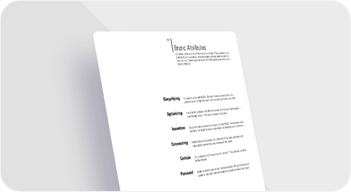 01 Brand Attributes Our brand attributes are at the core of our brand. They summarize our promise to our customers, showing people not only what we do, but how we do it. Everything that bears the FedEx name should live up to these attributes. Simplifying It’s easy to work with FedEx. We don’t waste anyone’s time. Our procedures are straightforward, and our communications are clear. Optimizing Every FedEx customer has different needs. We find the right solution — and the right price — for each customer’s business. Inventive Global business constantly changes. So does FedEx. As we invent new solutions, we lead the way in operations, technology and e-commerce. Connecting FedEx makes connections. Our networks link people, packages and information around the clock and around the world. Certain Our customers don’t have time for “almost.” They demand certainty. FedEx delivers. Personal FedEx customers are people, not transactions. We get to know each customer and offer them the tools they need to achieve their goals. Go to > fedexbrand.com > Main > Brand Philosophy > Our Attributes