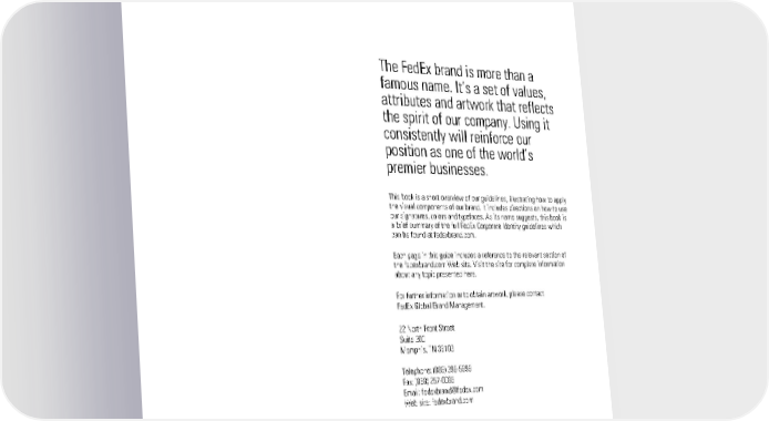 fedexbrand.com The FedEx brand is more than a famous name. It’s a set of values, attributes and artwork that reflects the spirit of our company. Using it consistently will reinforce our position as one of the world’s premier businesses. This book is a short overview of our guidelines, illustrating how to apply the visual components of our brand. It includes directions on how to use our signatures, colors and typefaces. As its name suggests, this book is a brief summary of the full FedEx Corporate Identity guidelines which can be found at fedexbrand.com. Each page in this guide includes a reference to the relevant section of the fedexbrand.com Web site. Visit the site for complete information about any topic presented here. For further information or to obtain artwork, please contact FedEx Global Brand Management. 22 North Front Street Suite 300 Memphis, TN 38103 Telephone: (888) 399-5999 Fax: (888) 257-0085 Email: fedexbrand@fedex.com Web site: fedexbrand.com Go to > f e d e x b r a n d .com > Main