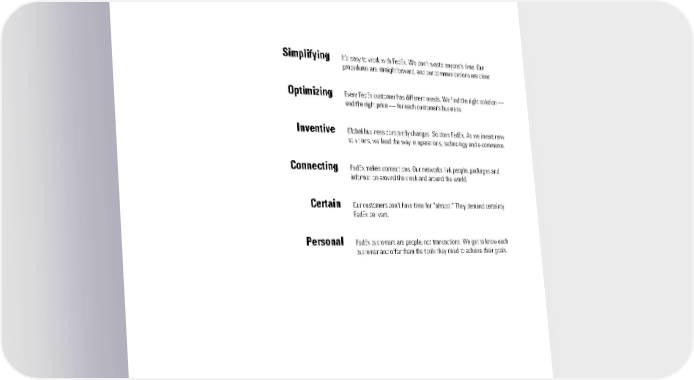 01 Brand Attributes Our brand attributes are at the core of our brand. They summarize our promise to our customers, showing people not only what we do, but how we do it. Everything that bears the FedEx name should live up to these attributes. Simplifying It’s easy to work with FedEx. We don’t waste anyone’s time. Our procedures are straightforward, and our communications are clear. Optimizing Every FedEx customer has different needs. We find the right solution — and the right price — for each customer’s business. Inventive Global business constantly changes. So does FedEx. As we invent new solutions, we lead the way in operations, technology and e-commerce. Connecting FedEx makes connections. Our networks link people, packages and information around the clock and around the world. Certain Our customers don’t have time for “almost.” They demand certainty. FedEx delivers. Personal FedEx customers are people, not transactions. We get to know each customer and offer them the tools they need to achieve their goals. Go to > fedexbrand.com > Main > Brand Philosophy > Our Attributes