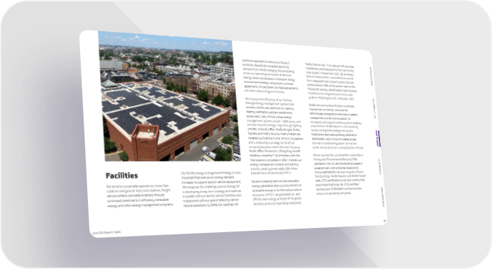 2022 ESG Report | FedEx 21 OUR PLANET DATA APPENDIX INTRODUCTION OUR PRINCIPLES OUR PEOPLE Facilities We strive to sustainably operate our more than 5,000 air and ground hubs, local stations, freight service centers, and retail locations through continued investments in efficiency, renewable energy, and other energy management programs. Our facility energy management strategy is more important than ever as our energy demand increases to support electric vehicle deployment. We recognize this challenge, and our Energy SIT is developing a long-term strategy and roadmap in parallel with our electric vehicle transition plan. In alignment with our goal of attaining carbon neutral operations by 2040, this roadmap will outline an approach to reduce our Scope 2 emissions despite the increased electricity demand from vehicle charging. We are looking across our operating companies to forecast energy needs and develop a renewable energy procurement strategy using power purchase agreements, virtual power purchase agreements, and other clean energy instruments. We increase the efficiency of our facilities through energy management systems that monitor, control, and optimize our lighting, heating, ventilation, and air-conditioning equipment. FedEx Office utilizes energy management systems at over 1,500 stores, and we have reduced energy usage through lighting retrofits at FedEx Office, FedEx Freight, FedEx Express, and FedEx Ground. FedEx Freight has installed LED lighting in one-third of its locations and is evaluating a strategy to retrofit all remaining locations within the next five years. FedEx Office finalized its LED lighting retrofit initiative—covering 71% of stores—with the final locations completed in 2021. Overall, our energy management systems and lighting retrofits saved approximately 208 million kilowatt hours of electricity in FY21. We are increasing both on-site renewable energy generation and our procurement of renewable energy to further reduce carbon emissions. In FY21, we generated on- and off-site solar energy at a total of 26 global locations across our operating companies. FedEx Ground has 17 on-site and off-site solar installations and energized its first community solar project in November 2021. At the FedEx Ground headquarters, we installed an almost four-megawatt solar carport system that will produce about 30% of the power used on the Pittsburgh campus. Additionally, FedEx Express installed a one-megawatt community solar system in Washington, D.C. in October 2021. FedEx Ground has three facilities and FedEx Express has one facility using fuel cell technologies alongside on-site solar or battery storage that provide the foundation for microgrids and support resiliency and emergency preparedness. FedEx Express is also exploring similar microgrid technologies to replace traditional diesel backup energy generators. Additionally, FedEx Ground installed a solar thermal air conditioning system to maintain cooler temperatures at a sorting facility in Florida. Where appropriate, we adopt the Leadership in Energy and Environmental Design (LEED) standard in the U.S. and the Building Research Establishment Environmental Assessment Method (BREEAM) in Europe to guide efficient facility design. FedEx Express and FedEx Freight seek LEED certification on all new construction, and in total FedEx has 39 LEED-certified facilities and 13 BREEAM-certified facilities across our operating companies.