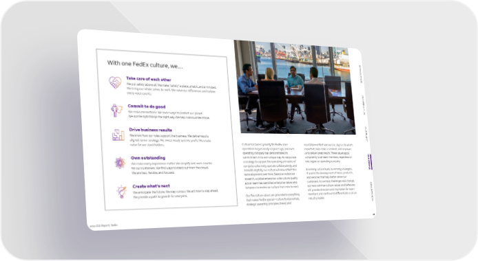 2022 ESG Report | FedEx 26 OUR PEOPLE INTRODUCTION OUR PRINCIPLES OUR PLANET DATA APPENDIX Culture has been a priority for FedEx since operations began nearly 50 years ago, and each operating company has demonstrated its commitment in its own unique way. As we pursue a strategy to support the operating principles of compete collectively, operate collaboratively, and innovate digitally, our culture will now reflect this same alignment over time. Based on extensive research, a global enterprise-wide culture quality action team has identified enterprise values and behaviors to evolve our culture from now to next. Our five culture values are grounded in everything that makes FedEx special—culture fundamentals, strategic operating principles, brand, and With one FedEx culture, we... Take care of each other We put safety above all. We make “safety” a place, a habit, and a mindset. We bring our whole selves to work. We value our differences and believe every voice counts. Commit to do good We make connections. We seeks ways to protect our planet. We do the right things the right way. We help communities thrive. Drive business results We know how our roles support the business. We deliver results aligned to our strategy. We invest wisely to drive profit. We create value for our stockholders. Own outstanding We make every experience matter. We simplify and work smarter for our customers. We find ways to stand out from the crowd. We are fast, flexible, and focused. Create what’s next We anticipate the future. We stay curious. We act now to stay ahead. We provide a path to growth for everyone. reputation—reflect who we are, align us to what’s important, help make us resilient, and empower us to deliver great results. These values apply consistently to all team members, regardless of role, region, or operating company. A winning culture leads to winning strategies. It sparks the development of ideas, products, and services that help better serve our customers. As we face challenges and change, our new common culture values and behaviors will provide direction and inspiration for team members and continue to differentiate us as an industry leader.