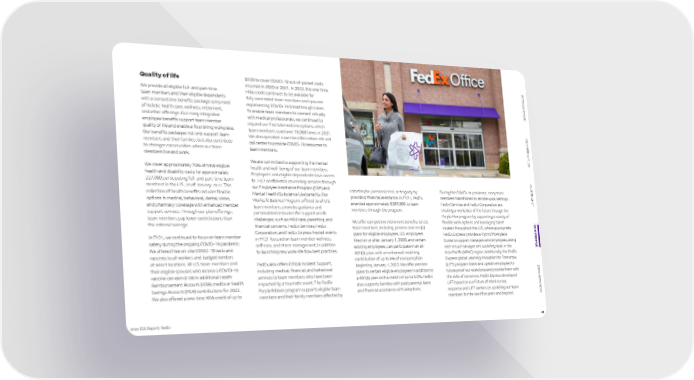 2022 ESG Report | FedEx 28 OUR PEOPLE INTRODUCTION OUR PRINCIPLES OUR PLANET DATA APPENDIX Quality of life We provide all eligible full- and part-time team members and their eligible dependents with a competitive benefits package comprised of holistic health care, wellness, retirement, and other offerings. Our many integrated employee benefits support team member quality of life and enable a flourishing workplace. Our benefits packages not only support team members and their families, but also contribute to stronger communities where our team members live and work. We cover approximately 70% of total eligible health and disability costs for approximately 227,000 participating full- and part-time team members in the U.S., as of January 2022. This collection of health benefits includes flexible options in medical, behavioral, dental, vision, and pharmacy coverage with enhanced member support services. Through our plan offerings, team members pay lower contributions than the national average. In FY21, we continued to focus on team member safety during the ongoing COVID-19 pandemic. We offered free on-site COVID-19 tests and vaccines to all workers and badged vendors at select locations. All U.S. team members and their eligible spouses who receive a COVID-19 vaccine can earn $100 in additional Health Reimbursement Account (HRA) credits or Health Savings Account (HSA) contributions for 2022. We also offered a one-time HRA credit of up to $500 to cover COVID-19 out-of-pocket costs incurred in 2020 or 2021. In 2022, this one-time HRA credit continues to be available for fully vaccinated team members and spouses experiencing COVID-19 breakthrough cases. To enable team members to connect virtually with medical professionals, we continued to expand our free telemedicine options, which team members used over 19,000 times in 2021. We also operated a vaccine information site and call center to provide COVID-19 resources to team members. We are committed to supporting the mental health and well-being of our team members. Employees and eligible dependents have access to 24/7 confidential counseling services through our Employee Assistance Program (EAP) and Mental Health/Substance Use benefits. Our WorkLife Balance Program, offered to all U.S. team members, provides guidance and personalized resources for support on life challenges, such as child care, parenting, and financial concerns. FedEx Services, FedEx Corporation, and FedEx Express hosted events in FY21 focused on team member wellness, self-care, and stress management, in addition to launching new work-life flow best practices. FedEx also offers Critical Incident Support, including medical, financial, and behavioral services to team members who have been impacted by a traumatic event. The FedEx Purple Ribbon program supports eligible team members and their family members affected by catastrophe, personal crisis, or tragedy by providing financial assistance. In FY21, FedEx awarded approximately $307,000 to team members through the program. We offer competitive retirement benefits to U.S. team members, including pension and 401(k) plans for eligible employees. U.S. employees hired on or after January 1, 2020, and certain existing employees, can participate in an all- 401(k)-plan, with an enhanced matching contribution of up to 8% of compensation beginning January 1, 2022. We offer pension plans to certain eligible employees in addition to a 401(k) plan with a match of up to 3.5%. FedEx also supports families with paid parental leave and financial assistance with adoptions. During the COVID-19 pandemic, many team members transitioned to remote work settings. FedEx Services and FedEx Corporation are creating a workplace of the future through the Purple Flex program by supporting a variety of flexible work options and leveraging talent located throughout the U.S., where appropriate. FedEx Express provides a Hybrid Workplace Guide to support managers and employees, along with virtual management upskilling tools in the Asia-Pacific (APAC) region. Additionally, the FedEx Express global Learning Innovation for Tomorrow (LiFT) program trains and upskills employees to future proof our workforce and provide them with the skills of tomorrow. FedEx Express developed LiFT based on our Future of Work survey response and LiFT centers on upskilling our team members for the next five years and beyond.