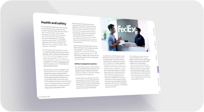 2022 ESG Report | FedEx 33 OUR PEOPLE INTRODUCTION OUR PRINCIPLES OUR PLANET DATA APPENDIX Health and safety Our longstanding “Safety Above All” philosophy is a top priority across our enterprise and in our day-to-day work. Robust policies, continual team member education, and innovative technology investments are the foundation of our commitment to make workplaces and communities safer for our employees, customers, and the public. The Governance, Safety, and Public Policy Committee of our Board oversees our safety strategies, policies, programs, and practices. We constantly evaluate and strive to improve our operational safety performance by tracking key safety metrics, reviewing the effectiveness of new metrics, and working toward a holistic safety-reporting platform. In FY21, our lost- time-injury rate was 3.99, an increase of 18.6% compared to FY20. See our Data appendix for more information on our FY21 and year-over- year safety performance. We depend on the proactive engagement and involvement of our team members to prevent accidents and injuries. Employees at FedEx Express can provide direct feedback on how to improve safety performance through the bi- annual Aviation Safety Culture Survey. Team member feedback has allowed us to create action programs for safety performance improvement, and we expanded this U.S.-based survey to all FedEx Express global regions in 2021. FedEx Express also implemented a Live Safe mobile app where all team members can submit safety reports, which are monitored 24/7 by the FedEx Security team. FedEx Express piloted an expansion of this program at the Memphis hub to provide team members with a central kiosk to report safety incidents or concerns. We continually look to increase our team members’ accessibility to reporting mechanisms and are in the process of launching the kiosk in eight more hubs across the U.S. FedEx Express launched Stay Sharp in 2020, an interactive program that encourages employee safety engagement and awareness and recognizes team members for working safely. Stay Sharp continued to expand in 2021 with safety teams in Canada, Latin America, Asia, and Europe embracing and modifying the program to meet their needs. Safety management systems We utilize safety management systems (SMS) to reduce work-related injuries and illnesses. Each operating company implements policies and procedures to adhere to international standards and manage health and safety risks. The FedEx SMS Accountable Executive Team meets quarterly to review safety performance, and the President and CEO of FedEx Express collaborates with the Safety and Airworthiness Vice President, among other safety staff, to evaluate progress against safety goals. The FedEx Express Safety Management System (FXE-SMS), implemented with guidance from the Federal Aviation Administration, provides consistent policies, processes, and procedures to limit human error in our aviation operations. The FXE-SMS supports team members in the identification and reporting of potential hazards and better enables our safety culture. In FY21, FedEx Express began developing a mitigation tracking system to centralize data collection, which helped facilitate safety performance measurement and ongoing evaluation of safety controls. FedEx Express International implements an incident management system that supports root cause analysis and enables better action planning. In 2021, we expanded this system to our operations in the Middle East, India, and South Africa. In FY21, FedEx Ground created an Operations Safety Specialist (OSS) position in strategic locations to drive the success of safety strategies. OSS team members create customized safety strategies within their local operating environment and are trained to identify and mitigate workplace safety hazards. Additionally, FedEx Ground offers the Leading with Safety program that prepares managers to create a safe workplace culture, enabling employees to execute safety processes, detect hazards, and stop work when necessary. As of December 2021, 877 participants in the U.S. and Canada have completed the program.