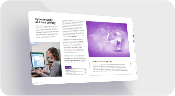 2022 ESG Report | FedEx 10 OUR PRINCIPLES DATA APPENDIX INTRODUCTION OUR PLANET OUR PEOPLE FedEx Data Privacy Day Our Corporate Integrity and Compliance department hosted our third annual FedEx Data Privacy Day in January 2022. The event was held virtually and welcomed all FedEx employees in Asia, Europe, North America, South America, Australia, and Africa to learn more about privacy and how we manage data. The event kicked off with a keynote speech from the CEO of FedEx Dataworks. In total, more than 1,800 employees attended the event. Cybersecurity and data privacy We recognize the importance of protecting the privacy of our customers, vendors, and team members, and we deliver on this commitment by proactively ensuring a safe and secure online environment. With the increasing presence and sophistication of online threats, we must ensure continuous improvement to protect our business and our customers. The Cyber and Technology Oversight Committee of the FedEx Board is responsible for reviewing the management and mitigation of our cyber and technology-related risks and discussing these initiatives with leadership. Our Global Privacy Office regularly reviews our practices and policies to ensure we maintain compliance with all relevant regulations across our operating companies. Our Internal Audit team also conducts periodic audits of our Privacy Compliance Program to ensure our controls are working effectively. Educating our team members is critical to our cybersecurity process, and we provide annual information security and data privacy trainings. These courses address a range of topics, including awareness regarding social engineering, cybercrimes, and data protection. We also conduct periodic phishing tests to ensure our team members are aware of and can recognize malicious phishing attempts. The FedEx Trust Center website provides more information on how we protect customer privacy along with resources to help our customers submit data subject access requests and identify, report, and mitigate risks in the e-commerce market. Global Privacy Policy FedEx Privacy Notice KEY LINKS