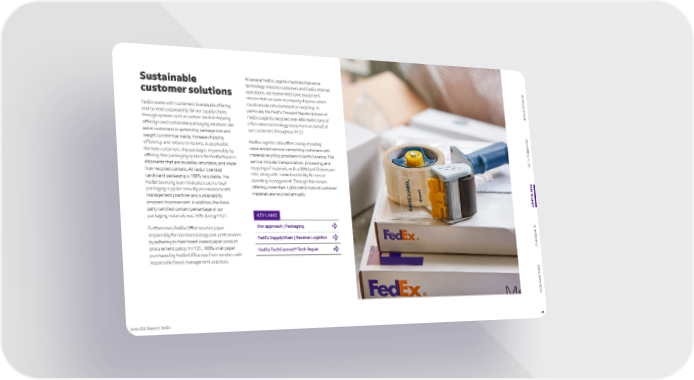 2022 ESG Report | FedEx 23 OUR PLANET DATA APPENDIX INTRODUCTION OUR PRINCIPLES OUR PEOPLE Sustainable customer solutions FedEx works with customers to evaluate offering end-to-end sustainability for our supply chains through options such as carbon neutral shipping offerings and sustainable packaging solutions. We assist customers in optimizing package size and weight to minimize waste, increase shipping efficiency, and reduce emissions, as applicable. We help customers ship packages responsibly by offering free packaging options for FedEx Express shipments that are reusable, recyclable, and made from recycled content. All FedEx-branded cardboard packaging is 100% recyclable. The FedEx Sourcing team evaluates each critical packaging supplier annually on environmental management practices and sustainability program improvement. In addition, the third- party certified content percentage of our packaging materials was 75% during FY21. Furthermore, FedEx Office sources paper responsibly for commercial copy and print services by adhering to their forest-based paper product procurement policy. In FY21, 100% of all paper purchased by FedEx Office was from vendors with responsible forest-management practices. At several FedEx Logistics facilities that serve technology industry customers and FedEx internal operations, we receive electronic equipment returns that we work to properly dispose, which could include refurbishment or recycling. In particular, the FedEx Forward Depots division of FedEx Logistics recycled over 464 metric tons of information technology equipment on behalf of our customers throughout FY21. FedEx Logistics also offers a long-standing value-added service connecting customers with material recycling providers in North America. This service includes transportation, processing, and recycling of materials, with a 99% landfill diversion rate, along with 100% traceability for secure inventory management. Through this service offering, more than 1,000 metric tons of customer materials are recycled annually. Our approach | Packaging FedEx SupplyChain | Reverse Logistics FedEx TechConnect® Tech Repair KEY LINKS