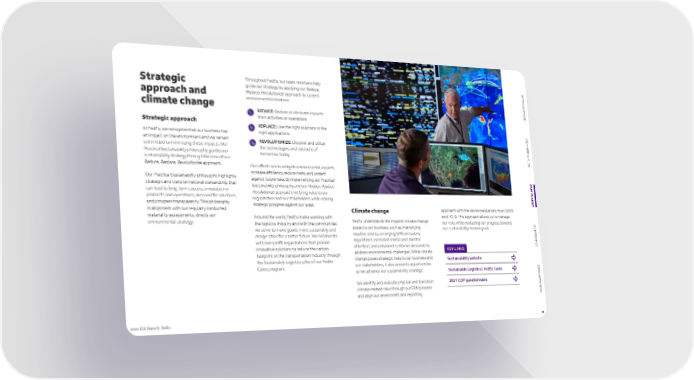 2022 ESG Report | FedEx 14 OUR PLANET DATA APPENDIX INTRODUCTION OUR PRINCIPLES OUR PEOPLE Strategic approach and climate change Strategic approach At FedEx, we recognize that our business has an impact on the environment and we remain committed to minimizing these impacts. Our Practical Sustainability philosophy guides our sustainability strategy through the lens of our Reduce, Replace, Revolutionize approach. Our Practical Sustainability philosophy highlights strategic and transformational stewardship that can lead to long-term success, innovation in products and operations, demand for solutions, and progress transparency. This philosophy, in alignment with our regularly conducted materiality assessments, directs our environmental strategy. Throughout FedEx, our team members help guide our strategy by applying our Reduce, Replace, Revolutionize approach to current environmental initiatives. REDUCE: Reduce or eliminate impacts from activities or operations REPLACE: Use the right solutions in the right applications REVOLUTIONIZE: Discover and utilize the technologies and solutions of tomorrow, today Our efforts aim to mitigate environmental impacts, increase efficiency, reduce costs, and protect against future risks. By implementing our Practical Sustainability philosophy and our Reduce, Replace, Revolutionize approach, we bring value to our organization and our stakeholders while making strategic progress against our goals. Around the world, FedEx is also working with the logistics industry and with the communities we serve to move goods more sustainably and design cities for a better future. We collaborate with non-profit organizations that provide innovative solutions to reduce the carbon footprint of the transportation industry through the Sustainable Logistics pillar of our FedEx Cares program. Climate change FedEx understands the impacts climate change poses to our business, such as intensifying weather events, emerging GHG emissions regulations, increased media and investor attention, and enhanced customer demands to address environmental challenges. While climate change poses strategic risks to our business and our stakeholders, it also presents opportunities as we advance our sustainability strategy. We identify and evaluate physical and transition climate-related risks through our ERM process and align our assessment and reporting approach with the recommendations from SASB and TCFD. This approach allows us to manage our risks while evaluating our progress towards our sustainability-related goals. Sustainability website Sustainable Logistics | FedEx Cares 2021 CDP questionnaire KEY LINKS