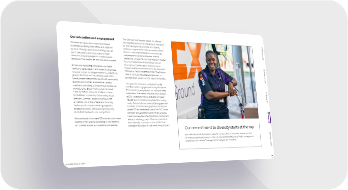 2022 ESG Report | FedEx 31 OUR PEOPLE INTRODUCTION OUR PRINCIPLES OUR PLANET DATA APPENDIX Our commitment to diversity starts at the top The FedEx Board of Directors includes 12 directors, four of whom are women and four of whom are ethnically diverse. In the U.S., women represent 27% of FedEx management employees, while 41% of management employees are minorities. Our education and engagement We strive to have a workplace where team members can bring their whole and best self to work. Through education, training, regular communications, and resources our team members are encouraged to maintain open dialogues that lead to an inclusive environment. Across our operating companies, our team members participate in employee-led business resource teams, employee networks, and affinity groups that help recruit, develop, and retain talent, create connections, and build community. Numerous networks are available to team members, including, but not limited to: Women in Leadership, Black Professionals Network, Hispanic Action Network, All-Generations, Multi-Ethnic Leadership Community, Asian Network, Women Leading Change, LGBT & Friends, U.S. Military Veterans, Growing Professionals, Parents Working Together, EnABLE Network, Men Leading Inclusively, Multi-Faith Network, and many others. We continued to increase DEI education for team members this year by providing micro-learning DEI content across our operating companies. The DEI Real Talk Speaker Series, for officers and directors across the enterprise, is designed to foster acceptance, promote anti-biases, and encourage a more inclusive society. FedEx Ground launched SVP Real Conversations to prepare participants for the next level of leadership through Senior Vice President-hosted forums. FedEx Ground also hosted several Courageous Conversation sessions where leaders and team members candidly discussed DEI topics. FedEx Freight launched The Culture Brief & DEI Tune-Up email and podcast to provide short content on DEI topics to leaders. This year, FedEx Services included five DEI questions in its engagement survey to capture team member perspectives on inclusion in the workplace. This overall inclusion index showed a 92% favorability rating and approximately 13,500 team members completed the survey. FedEx Ground also included a DEI engagement question in its annual engagement survey and added DEI as a standard goal in the FY22 team member annual performance review process. FedEx Express launched the Convene program, where a rotating group of four vice president- level diversity sponsors mentor other team members through a virtual mentoring program.