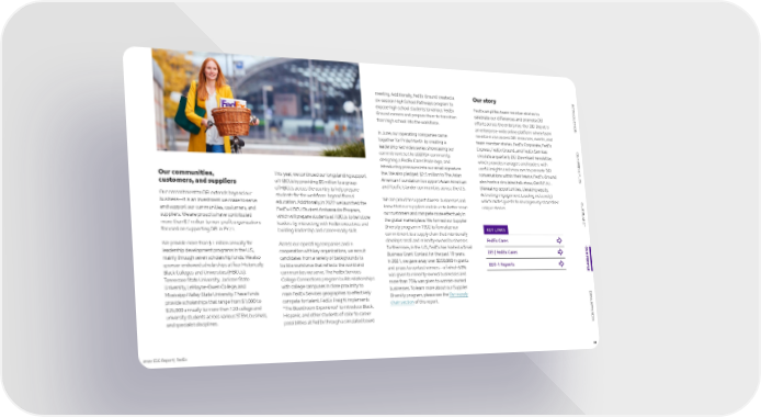 2022 ESG Report | FedEx 32 OUR PEOPLE INTRODUCTION OUR PRINCIPLES OUR PLANET DATA APPENDIX Our story FedEx amplifies team member stories to celebrate our differences and promote DEI efforts across the enterprise. Our DEI Depot is an enterprise-wide online platform where team members can access DEI resources, events, and team member stories. FedEx Corporate, FedEx Express, FedEx Ground, and FedEx Services circulate a quarterly DEI Download newsletter, which provides managers and leaders with useful insights and resources to promote DEI conversations within their teams. FedEx Ground also hosts a simulated talk show, Get R.E.A.L. (Revealing opportunities, Elevating equity, Activating engagement, Leading inclusively) which invites guests to courageously share their unique stories. Our communities, customers, and suppliers Our commitment to DEI extends beyond our business—it is an investment we make to serve and support our communities, customers, and suppliers. We are proud to have contributed more than $7 million to non-profit organizations focused on supporting DEI in FY21. We provide more than $1 million annually for leadership development programs in the U.S., mainly through seven scholarship funds. We also sponsor endowed scholarships at four Historically Black Colleges and Universities (HBCUs): Tennessee State University, Jackson State University, LeMoyne-Owen College, and Mississippi Valley State University. These funds provide scholarships that range from $1,000 to $25,000 annually to more than 120 college and university students across various STEM, business, and specialist disciplines. This year, we continued our longstanding support of HBCUs by providing $5 million to a group of HBCUs across the country to help prepare students for the workforce beyond formal education. Additionally, in 2022 we launched the FedEx-HBCU Student Ambassador Program, which will prepare students at HBCUs to be future leaders by interacting with FedEx executives and building leadership and career-ready skills. Across our operating companies and in cooperation with key organizations, we recruit candidates from a variety of backgrounds to build a workforce that reflects the world and communities we serve. The FedEx Services College Connections program builds relationships with college campuses in close proximity to main FedEx Services geographies to effectively compete for talent. FedEx Freight implements “The Boardroom Experience” to introduce Black, Hispanic, and other students of color to career possibilities at FedEx through a simulated board meeting. Additionally, FedEx Ground created a six-session High School Pathways program to expose high school students to various FedEx Ground careers and prepare them to transition from high school into the workforce. In June, our operating companies came together for Pride Month by creating a leadership-led video series showcasing our commitment to the LGBTQ+ community, designing a FedEx Cares Pride logo, and introducing pronouns into our email signature line. We also pledged $2.5 million to The Asian American Foundation to support Asian American and Pacific Islander communities across the U.S. We are proud to support diverse businesses and know that our suppliers enable us to better serve our customers and compete more effectively in the global marketplace. We formed our Supplier Diversity program in 1992 to formalize our commitment to a supply chain that intentionally develops small and minority-owned businesses. Furthermore, in the U.S., FedEx has hosted a Small Business Grant Contest for the past 10 years. In 2021, we gave away over $250,000 in grants and prizes to contest winners—of which 50% was given to minority-owned businesses and more than 75% was given to woman-owned businesses. To learn more about our Supplier Diversity program, please see the Our supply chain section of this report. FedEx Cares DEI | FedEx Cares EEO-1 Reports KEY LINKS