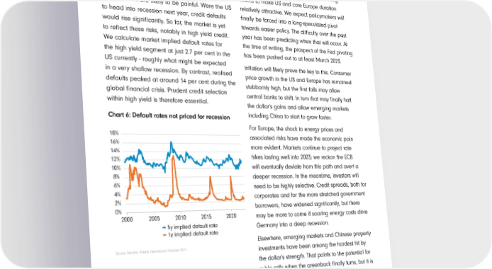 Too much too late Looking at duration It is clear that developed world central banks On the surface, the high risk of a hard landing began this round of tightening too late and that seems to make US and core Europe duration the outcomes are likely to be painful. Were the US relatively attractive. We expect policymakers will to head into recession next year, credit defaults finally be forced into a long-speculated pivot would rise significantly. So far, the market is yet towards easier policy. The difficulty over the past to reflect these risks, notably in high yield credit. year has been predicting when that will occur. At We calculate market implied default rates for the time of writing, the prospect of the Fed pivoting the high yield segment at just 2.7 per cent in the has been pushed out to at least March 2023. US currently - roughly what might be expected Inflation will likely prove the key to this. Consumer in a very shallow recession. By contrast, realised price growth in the US and Europe has remained defaults peaked at around 14 per cent during the stubbornly high, but the first falls may allow global financial crisis. Prudent credit selection central banks to shift. In turn that may finally halt within high yield is therefore essential. the dollar’s gains and allow emerging markets Chart 6: Default rates not priced for recession including China to start to grow faster. For Europe, the shock to energy prices and 18% associated risks have made the economic pain 16% more evident. Markets continue to project rate 14% 12% hikes lasting well into 2023; we reckon the ECB 10% will eventually deviate from this path and avert a 8% deeper recession. In the meantime, investors will 6% need to be highly selective. Credit spreads, both for 4% corporates and for the more stretched government 2% 0% borrowers, have widened significantly, but there 2000 2005 2010 2015 2020 may be more to come if soaring energy costs drive 5y implied default rate Germany into a deep recession. 1y implied default rate Elsewhere, emerging markets and Chinese property Source: Refinitiv, Fidelity International, October 2021. investments have been among the hardest hit by the dollar’s strength. That points to the potential for The interest burden is also likely to be crucial. If a big rally when the greenback finally turns, but it is high yield is to mean yields of 8-10 per cent in again perilously difficult picking the right moment. the months and possibly years ahead, then this With that cocktail of risks in mind, as we navigate will alter the outlook for both existing and future various stages of the hiking cycle, it is inevitable borrowers. Adjustments will be required across that some investors will look to shift portfolio asset the curve. 15 Investment Outlook Fidelity International