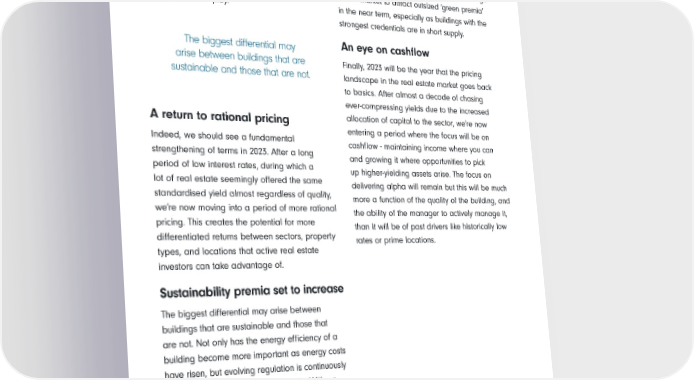 Instead, we expect the upcoming cycle to be Some buildings will become stranded as landlords relatively short. If interest rate levels begin to can no longer lease them unless they meet stabilise, we believe that most valuations will minimum standards. This will increase not only the readjust by the middle of next year. As the market ‘brown discount’ for non-compliant buildings but moves closer to the bottom, there will be some also the scope for the most sustainable buildings interesting opportunities for investors with long- on the market to attract outsized ‘green premia’ term capital to deploy. in the near term, especially as buildings with the strongest credentials are in short supply. The biggest differential may An eye on cashflow arise between buildings that are Finally, 2023 will be the year that the pricing sustainable and those that are not. landscape in the real estate market goes back to basics. After almost a decade of chasing ever-compressing yields due to the increased A return to rational pricing allocation of capital to the sector, we’re now entering a period where the focus will be on Indeed, we should see a fundamental cashflow - maintaining income where you can strengthening of terms in 2023. After a long and growing it where opportunities to pick period of low interest rates, during which a up higher-yielding assets arise. The focus on lot of real estate seemingly offered the same delivering alpha will remain but this will be much standardised yield almost regardless of quality, more a function of the quality of the building, and we’re now moving into a period of more rational the ability of the manager to actively manage it, pricing. This creates the potential for more than it will be of past drivers like historically low differentiated returns between sectors, property rates or prime locations. types, and locations that active real estate investors can take advantage of. Sustainability premia set to increase The biggest differential may arise between buildings that are sustainable and those that are not. Not only has the energy efficiency of a building become more important as energy costs have risen, but evolving regulation is continuously ratcheting up sustainability standards. With an alphabet soup of requirements from EPC ratings to Sustainable Financial Disclosure Regulation coming thick and fast across Europe especially, the next few years will bring huge opportunities and risks for those who can get ahead of the changes and those that get left behind. 20 Investment Outlook Fidelity International