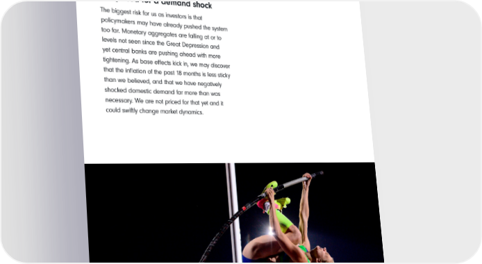 allocations towards higher quality assets. We can see that flight to quality already in recent demand for cash strategies. Not priced for a demand shock The biggest risk for us as investors is that policymakers may have already pushed the system too far. Monetary aggregates are falling at or to levels not seen since the Great Depression and yet central banks are pushing ahead with more tightening. As base effects kick in, we may discover that the inflation of the past 18 months is less sticky than we believed, and that we have negatively shocked domestic demand far more than was necessary. We are not priced for that yet and it could swiftly change market dynamics. Yields to hold higher for longer. Credit: Josep Lago / Contributor, Getty Images. 16 Investment Outlook Fidelity International