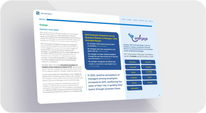 2021 ESG Report SOCIAL Engage Employee Voices Matter Fifth Third’s continuous listening strategy forms the foundation of Fifth Third’s culture. Our holistic approach to collecting, measuring and responding to employee feedback ensures that we engage with employees at critical points during their careers and during times of change in our business or work environment. Fifth Third’s Board of Directors and executive management assess employee engagement on a regular basis through our annual engagement survey. In 2021, our overall engagement score was 65%. In an environment of uncertainty and complexity, our engagement score for all employees declined from 69% in 2019 but remained comparable to other U.S. fnancial services companies. The Bank did not conduct a survey in 2020 due to the pandemic, but instead opted to conduct a series of pulse surveys to gauge employee viewpoints and feedback. Of special note in 2021 is that the positive perceptions of managers among employees increased to 84% , reinforcing the value of their role in guiding their teams through uncertain times. All four questions related to managers yielded favorable scores. Our exit survey results show that advocacy, which indicates the likelihood that an employee would continue to be a supporter of the Company or return to Fifth Third in the future, was 66%, down 5% from 2020, yet still 9% higher than the national average. As we continue to advance our commitment to ethics and integrity, an optional pulse survey was conducted with all employees in December 2021. The 10-question survey allowed us to understand better employees’ perceptions and experiences around doing the right thing in relation to risk management. 2021 Employee Viewpoints Survey Questions Related to Managers Yield Favorable Results • My manager holds people appropriately accountable (81% favorable). • My manager sets clear expectations and goals with me (85% favorable). • My manager provides valuable feedback through the year that allows me to improve my performance (83% favorable). • My manager recognizes my eforts and results in a way that is meaningful to me (77% favorable). In 2021, positive perceptions of managers among employees increased to 84%, reinforcing the value of their role in guiding their teams through uncertain times. Contents Introduction Economic Environment Social Governance Annually, Fifth Third participates in the Top Workplace program managed by Energage. Winners are selected based on an all-employee survey conducted by Energage. Fifth Third received an Energage Top Workplace Award in 11 markets , up from 10 markets in 2020. Cincinnati Louisville Cleveland Charlotte Toledo S. Florida (East Coast) Columbus Tampa Detroit Orlando Indianapolis 62