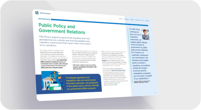 2021 ESG Report GOVERNANCE Public Policy and Government Relations Fifth Third is subject to government regulation and risks generated by new, complex and evolving legislative and regulatory requirements that impact nearly every aspect of our operations. As a result, customers, employees and shareholders have a measurable stake in the outcome of certain public policy discussions. To mitigate this risk and work toward favorable outcomes, we participate in the public policy process. Our government afairs program is designed to give us a coordinated voice in public policy through a partnership between the Government Afairs team and Company leaders . F ifth Third’s advocacy eforts are executed at the local, state and federal level by registered lobbyists. Disclosure of federal lobbying activity occurs via the U.S. Congress, and disclosure of non-federal lobbying activity is provided to appropriate local and state agencies as required by law. Fifth Third’s Political Action Committee supports candidates at the federal, state and local level . To mitigate legislative and regulatory risks and work toward favorable outcomes, we participate in the public policy process through our government afairs program. Contents Funds in the PAC consist of voluntary personal contributions from eligible ofcers of the Company and its subsidiaries. No Company funds are contributed to the PAC. Disclosure of federal PAC activity can be viewed at fec.gov and our website. Disclosure of PAC activity at the local and state levels is provided to state election authorities in compliance with applicable law and on our website. Fifth Third’s political contributions are governed by the Government Afairs Policy . The Nominating and Corporate Governance Committee of the Board reviews political contributions semi-annually and approves the policy annually. Fifth Third also maintains a Political Activity Policy that ensures the compliance of the Bank and its employees with laws and regulations governing political contributions. Introduction Economic Environment Social Governance “As Fifth Third continues to grow and serve customers nationwide, we engage public ofcials across all levels of government on public policy issues afecting the Company, its customers, employees and shareholders. We promote sound public policy to ensure a regulatory and political climate that fosters economic growth, competition, prosperity and innovation on behalf of our stakeholders.” -SUSAN ZAUNBRECHER, EXECUTIVE VICE PRESIDENT, CHIEF LEGAL OFFICER 87