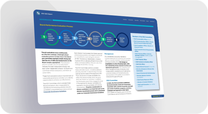2021 ESG Report C o ntents Introduction Economic Environment Social Governance GOVERNANCE Board Performance Evaluation Process Director Written 2 interviews evaluation conducted by questionnaire lead independent completed director 1 Though evaluations occur continuously, our directors undergo a thorough annual evaluation process to help ensure that Board and committee oversight remain strong and that the mix of skills and backgrounds on the Board remains appropriate . The evaluation process includes one-on-one discussions between the lead independent director and each other independent director, full Board and committee written evaluations, and follow-up action items. These frank evaluations are an important part of sustainable governance and allow us to identify opportunities to enhance our efectiveness. The NCG Committee, which oversees these Board evaluations, also is responsible for identifying and assessing potential director candidates using established criteria and our Corporate Governance Guidelines . Anonymized Opportunities for results reviewed 4 improvement by NCG identified and Committee and prioritized Board 3 Each director must possess the highest personal and professional ethics and integrity and should be committed to representing the interests of Fifth Third and our stakeholders. Directors must be willing to devote sufcient time to their duties and responsibilities. Directors also must undergo annual ethics training. The NCG Committee carefully considers these and other factors—including judgment, diversity and skills—in determining a mix that best serves the needs of the Board and Fifth Third. We strive to include candidates who refect the diverse markets which we serve when we choose our nominees. In addition, any third-party search frms engaged to assist in the searches for director candidates are required to include candidates with diverse characteristics. Proactive consideration of diverse candidates is an important part of the director recruitment process and is prioritized under our Corporate Governance Guidelines . Action items 6 Action items’ developed and progress implemented monitored 5 Management Our management structure is intended to facilitate leadership that is efective and consistent with our corporate standards, and that promotes a strong corporate culture. We manage our organization on a line of business basis, while also maintaining strong corporate functions and appropriate governance . Our Company’s most senior management body is Enterprise, which is responsible for developing and implementing corporate strategy and managing executive- level operations. ESG updates are provided to Enterprise throughout the year. ESG Committee In 2020, the NCG Committee established the Environmental, Social and Governance Committee with a charter to provide oversight and review of policies, programs, practices, strategies and approach to ESG topics . ESG updates are regularly given to the NCG Committee as well as the Board of Directors. Members of the ESG Committee • Chief Sustainability Ofcer (chair) • Chief Communications Ofcer, Deputy General Council & Board Secretary • Chief Compliance Ofcer; Director of Financial Crimes • Chief Corporate Social Responsibility Ofcer • Chief Fiduciary Ofcer; Director, Business Controls (Wealth & Asset Management) • Chief Financial Ofcer • Chief Inclusion & Diversity Ofcer • Chief Risk Ofcer • Deputy General Counsel (Corporate) • Director, Enterprise & Climate Risk Governance • Head of Commercial Administration • Director, Business Controls (Consumer) • Chief Human Resources Ofcer • Director of Investor Relations • Chief Audit Executive (non-voting member) CONTINUED 83