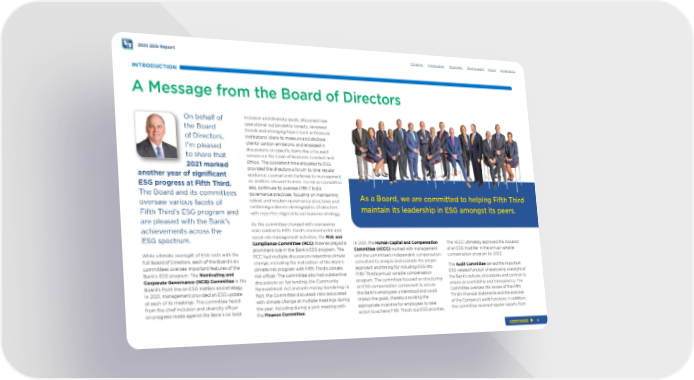 INTRODUCTION 2021 ESG Report Contents Introduction Economic Environment Social Governance A Message from the Board of Directors On behalf of the Board of Directors, I’m pleased to share that 2021 marked another year of signifcant ESG progress at Fifth Third. The Board and its committees oversaw various facets of Fifth Third’s ESG program and are pleased with the Bank’s achievements across the ESG spectrum. While ultimate oversight of ESG rests with the full Board of Directors, each of the Board’s six committees oversee important features of the Bank’s ESG program. The Nominating and Corporate Governance (NCG) Committee is the Board’s front line on ESG matters and strategy. In 2021, management provided an ESG update at each of its meetings. The committee heard from the chief inclusion and diversity ofcer on progress made against the Bank’s six bold inclusion and diversity goals, discussed new operational sustainability targets, reviewed trends and emerging topics such as fnancial institutions’ plans to measure and disclose clients’ carbon emissions, and engaged in discussions on specifc items like a focused session on the Code of Business Conduct and Ethics. The consistent time allocated to ESG provided the directors a forum to give regular guidance, counsel and challenge to management on matters relevant to ESG. The NCG Committee also continues to oversee Fifth Third’s governance practices, focusing on maintaining robust and modern governance structures and sustaining a diverse demographic of directors with expertise aligned to our business strategy. As the committee charged with overseeing risks related to Fifth Third’s environmental and social risk management activities, the Risk and Compliance Committee (RCC) likewise played a prominent role in the Bank’s ESG program. The RCC had multiple discussions regarding climate change, including the maturation of the Bank’s climate risk program with Fifth Third’s climate risk ofcer. The committee also had substantive discussions on fair lending, the Community Reinvestment Act and anti-money laundering. In fact, the Committee discussed risks associated with climate change at multiple meetings during the year, including during a joint meeting with the Finance Committee . As a Board, we are committed to helping Fifth Third maintain its leadership in ESG amongst its peers. In 2021, the Human Capital and Compensation Committee (HCCC) worked with management and the committee’s independent compensation consultant to analyze and evaluate the proper approach and timing for including ESG into Fifth Third’s annual variable compensation program. The committee focused on structuring an ESG compensation component to ensure the Bank’s employees understood and could impact the goals, thereby providing the appropriate incentive for employees to take action to achieve Fifth Third’s top ESG priorities. The HCCC ultimately approved the inclusion of an ESG modifer in the annual variable compensation program for 2022. The Audit Committee served the important ESG-related function of exercising oversight of the Bank’s policies, procedures and controls to ensure accountability and transparency. The Committee oversaw the review of the Fifth Third’s fnancial statements and the exercise of the Company’s audit functions. In addition, the committee received regular reports from CONTINUED 6