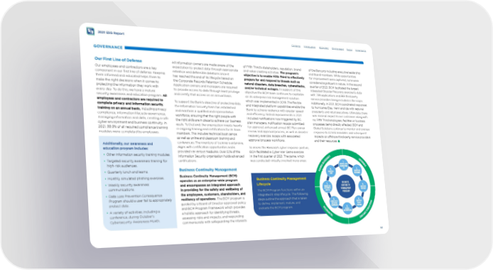 2021 ESG Report GOVERNANCE Our First Line of Defense Our employees and contractors are a key component in our frst line of defense. Keeping them informed and educated helps them to make the right decisions when it comes to protecting the information they work with every day. To do this, we have a mature security awareness and education program. All employees and contractors are required to complete privacy and information security training on an annual basis, including privacy compliance, information lifecycle governance, managing information and data, creating a safe cyber environment and business continuity. In 2021, 99.9% of all required compliance training modules were completed by employees. All information owners are made aware of the expectation to protect data through appropriate retention and defensible deletions once it has reached the end of its lifecycle based on the Corporate Records Retention Schedule. Application owners and managers are required to provide access to data through least privilege and certify that access on an annual basis. To support the Bank’s objective of protecting data, the Information Security team has established and maintains a qualifed and representative workforce, ensuring that the right people with the right skills are in place to achieve our business goals. To that end, the organization invests heavily in ongoing training and certifcations for its team members. This includes technical boot camps as well as online and classroom training and conferences. The inventory of training is extensive, aligns with certifcation opportunities and is provided via various mediums. Over 52% of the Information Security organization holds advanced certifcations. Business Continuity Management Business Continuity Management (BCM) operates as an enterprise-wide program and encompasses an integrated approach in providing for the safety and wellbeing of the employees, customers, shareholders, and resiliency of operations . The BCM program is guided by a Board of Director-approved policy and BCM Program Framework which provides a holistic approach for identifying threats, assessing risks and impacts, and responding commensurate with safeguarding the interests Contents of Fifth Third’s stakeholders, reputation, brand and value creating activities. The program’s objective is to enable Fifth Third to efectively prepare for and respond to threats such as natural disasters, data breaches, cyberattacks, and/or technical outages. In support of this objective the BCM team continues to capitalize on its enterprise risk management solution which was implemented in 2019. The fexible and integrated platform capabilities enable the Bank to achieve resilience with greater speed and efciency. Noted improvements in 2021 included notifcations now triggered by BC plan managers, notifcation recaps submitted for approval, enhanced annual BC Plan owner review and approval process, as well as disaster recovery exercise recaps with associated approval process workfows. To assess the Bancorp’s cyber response posture, BCM facilitated a Cyber War Game exercise in the frst quarter of 2021. The game, which was conducted virtually, involved many areas Introduction Economic Environment Social Governance of the Bancorp including executive leadership and Board members. While opportunities for improvement were captured, none were considered signifcant in nature. In the second quarter of 2021, BCM facilitated the largest integrated Disaster Recovery exercise to date with 739 applications and 383 third party service providers being included in the scope. Additionally, in 2021, BCM coordinated responses to hurricanes Elsa, Henri and Ida with regional presidents and retail executives. Ultimately, there was minimal impact to our customers along with no Fifth Third employees, facilities or business processes being directly afected. BCM and Global Solutions continue to monitor and oversee response to COVID mandates and subsequent impacts on ofshore third-party service providers and their resources. Additionally, our awareness and education program includes: • Other information security training modules . • Targeted security awareness training for high-risk audiences. • Quarterly lunch and learns. • Monthly simulated phishing exercises. • Weekly security awareness communications. • Data Loss Prevention Consequence Program should a user fail to appropriately protect data. • A variety of activities, including a conference, during October’s Cybersecurity Awareness Month. BUSINESS CONTINUITY MANAGEMENT PROGRAM G O V E R N A N C E R E G U L A T I O N S & C O M P L I A N C E C O L L A B O R A T I O N B U S I N E S S R E Q U I R E M E N T S 1. CULTIVATE A BCM CULTURE WITHIN 5/3 2. UNDERSTAND THE BUSINESS 3. CREATE BCM STRATEGIES 4. CREATE BCM PLANS & SOLUTIONS 5. DESIGN & IMPLEMENTATION 6. CONDUCT BCP & DR EXERCISE MAINTENANCE 7. CONDUCT SELF ASSESSMENT & ANALYSIS 8. MAINTAIN & AUDIT Business Continuity Management Lifecycle The BCM Program functions within an integrated 8 -step lifecycle. The following steps outline the approach that is taken to defne, implement, mature, and evaluate the BCM program. 92