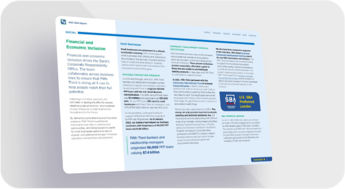 2021 ESG Report SOCIAL Financial and Economic Inclusion Financial and economic inclusion drives the Bank’s Corporate Responsibility Ofce. The team collaborates across business lines to ensure that Fifth Third is doing all it can to help people reach their full potential. Adopting a One Bank approach, the CRO team is leading the efort to reverse negative cycles among low- and moderate- income Americans to help build strong foundations for the future. By delivering comprehensive and innovative solutions, Fifth Third is tackling low homeownership rates in underserved communities, diminished access to capital for small businesses seeking to start or expand, and addressing the gap in fnancial education and workforce development. Small Businesses Small businesses are paramount to a vibrant, sustainable economy. Fifth Third supports small businesses both directly and indirectly to be a bridge to the services—including lending, lines of credit and other prducts—business owners most need to start and maintain their businesses and see them grow. PAYCHECK PROTECTION PROGRAM In 2020 and through June 2021, Fifth Third bankers and relationship managers worked tirelessly to support our business customers by working with them to originate 66,000 PPP loans with the U.S. Small Business Administration. The total value of those loans was $7.4 billion and supported over 835,000 jobs. Of our PPP loans, 96% went to small businesses with fewer than 50 employees, and 87% of the loans were for less than $150,000. As the pandemic continued, the Bank’s support shifted from PPP loan origination to PPP loan forgiveness. As of January 2022, our bankers had helped our business customers with forgiveness of 48,000 PPP loans worth $6 billion. Fifth Third bankers and relationship managers originated 66,000 PPP loans valuing $7.4 billion . Contents COMMUNITY DEVELOPMENT FINANCIAL INSTITUTIONS We know there are times when small businesses require additional assistance and guidance, and a key provider is community development fnancial institutions. These private institutions provide responsible, afordable capital to those who are unable to use traditional banking products or resources, and Fifth Third is committed to supporting them. In 2021, Fifth Third partnered with the Community Reinvestment Fund to leverage Connect2Capital , a digital collaboration platform that matches businesses with CDFIs in their communities in order for them to take the next step forward. Connect2Capital pairs small businesses with mission-driven lending partners that bridge the gap between where a business is and where it wants to go. We also provide capital directly to CDFIs. This money not only provides loans but invaluable coaching and technical assistance, too. We have strong working relationships with CDFIs in most of our markets. Among these is the Black Business Capital Financing Corp. in Florida, whose Construction Contractor’s Assistance Program we support. It provides Black contractors with BBCFC’s industry-specifc business advisory services, which include access to loan and bond capital and procurement advocacy. Introduction Economic Environment Social Governance We also have been a long-term supporter of the Columbus, Ohio-based Economic Community Development Institute , one of the top SBA intermediary microlenders. The Fifth Third Foundation has provided funding to support its Microenterprise program, which ofers capital, training and assistance to underserved and underbanked idea- and growth-stage business owners. In Cincinnati, Fifth Third supports the Greater Cincinnati Microenterprise Initiative and its program to start a loan pool to support minority businesses in the startup and growth phases of their business. U.S. SBA Preferred Lender SBA PROGRAM LENDING As a U.S. SBA Preferred Lender, we continue to invest in the SBA program and in our ability to ofer several types of SBA loans, including 7(a), Express and 504 loans. We are investing in technology and in our loan originators through focused SBA product training to help more customers gain access to the fexibility and versatility of SBA loan products. CONTINUED 71