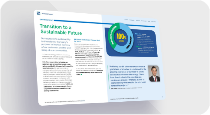 2021 ESG Report ENVIRONMENT Transition to a Sustainable Future Our approach to sustainability is driven by our Company’s purpose: to improve the lives of our customers and the well - being of our communities. Our business strategy embraces an inclusive, sustainable path forward. We believe that capital can be a force for positive change. Fifth Third is committed to helping our customers and communities move to a low- carbon, sustainable future and achieve positive social outcomes. We seek to provide our customers with products and services that will help them meet their evolving needs, and we hope to inspire and support our communities to drive toward more sustainable and inclusive solutions. We recognize the fnancial sector plays an important role in making the changes necessary to adapt to a changing planet and create more resilient communities. In 2022, we achieved our $8 billion sustainable fnance target that focused on renewable energy lending and fnancing. *The methodology used to prepare these fgures is available in the Additional Disclosures section of ir.53.com/esg . Contents Introduction Economic Environment Social Governance $4.9B in Lending Commitments and Asset Finance: Providing direct fnancing to companies and projects. This capital is provided by Fifth Third and is reported on our balance sheet.* $3.1B in Facilitation of Capital Raising: Helping customers raise debt and equity fnancing from other investors. 100 % ACHIEVED “Achieving our $8 billion renewable fnance goal ahead of schedule is a testament to the growing awareness of our need to create new sources of renewable energy. Clients have found value in the expertise and services we provide—fnancing as well as capital raising—that enables them to build renewable projects.” ERIC COHEN, MANAGING DIRECTOR, RENEWABLE ENERGY FINANCE. *Includes Dividend Finance’s production after Fifth Third closed on the acquisition in May 2022. $8 Billion Sustainable Finance Goal by 2025* Drawing from eight years’ experience in renewable lending since our frst renewable project fnancing in 2012, Fifth Third established its frst sustainable fnance goal in 2020. By 2025, the Bank would lend or fnance $8 billion in renewable projects, which we defned as solar, wind, geothermal, biomass and hydropower. We limited the scope of our public commitment to include only lending and facilitation of capital raising because these services contribute most directly to attracting new investments in renewable power. In 2022, Fifth Third achieved this goal and helped facilitate the completion of more than 600 renewable energy projects across 28 states. 34