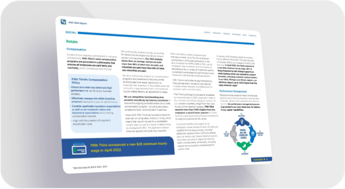 2021 ESG Report SOCIAL Retain Compensation As part of our ongoing commitment to inclusion and diversity, Fifth Third’s total compensation programs are grounded in a philosophy that ensures all employees are paid fairly and equitably, and in compliance with the law. Fifth Third’s Compensation Policy • Attract and retain top talent and high performers that will drive our business strategy. • Efectively manage risk within incentive programs designed to pay for performance. • Consider applicable regulatory expectations as well as our corporate values and behavioral expectations when making compensation awards. • Align with the creation of long-term shareholder value. We continuously analyze our pay, accounting f or factors like employee role, tenure, time in position and geography. Our 2021 analysis shows that, on average, women are paid more than 99% of what men are paid, and minorities are paid more than 99% of what non-minorities are paid. We also continuously analyze our compensation programs and practices to help ensure that all employees have equal opportunity to maximize their potential. In the unlikely event we encounter a pay disparity that is not explained by job-related factors, an adjustment is made. We use competitive benchmarking data provided annually by top industry consultants to ensure the ongoing competitiveness of our total compensation program, including base salary ranges and short- and long-term incentives. Since 2019, Fifth Third has honored a footprint- wide ban on using salary history in hiring, which means that we will not ask for a candidate’s current salary to use as a factor in determining an employment ofer. This approach reduces historical gender and racial pay inequities. Contents Fifth Third ofers a 401(k) retirement plan that pays a match up to 7% of an employee’s compensation. Employee participation in the plan increased from 83% to 84% in 2021, and all employees may contribute up to the maximum allowable by law. A variety of investment options is available to employees through the plan’s core funds and a self-directed brokerage feature. Fifth Third is committed to pay transparency. We publicize salary ranges for job postings in states where required, and additionally for positions with a virtual location. Fifth Third continued to evaluate its strategies for retaining talent in 2021, especially in light of the economic trend that saw great numbers of U.S. workers voluntarily resign from their jobs. As part of this retention strategy, Fifth Third awarded more than 7,500 eligible front-line employees a special bonus payment as thanks for their onsite work and continued commitment to keep the customer at the center. To provide stability and support to its employees’ needs outside of work, the Bancorp updated its time away policies, provided additional vacation time in 2021 and ofered back-up family care. Several retention actions have been executed in alignment with the Bank’s compensation philosophy, including special bonus programs implemented for certain roles. Introduction Economic Environment Social Governance In January 2018, the Bank raised its minimum hourly rate from $12 to $15. That was followed in October 2019 by an increase from $15 to $18 per hour. In April 2022, the Bank announced a new $20 minimum hourly wage. 95% of those impacted by this change support our retail banking center and operations support functions, including customer contact centers. In our Ohio, Michigan and Illinois regions, our minimum wage is up to 200% higher than the state minimum wage*. Performance Management Recognizing the value and impact of employee performance is vital to maintaining a strong culture and helps optimize both individual and collective success. Our performance management process is grounded in our Core Values and, for leaders, in our Leader Capabilities. Q1 GOAL SETTING ONGOING, Q4 Q2 REAL-TIME YEAR-END PERFORMANCE REVIEW COACHING AND CHECK-INS FEEDBACK Q3 DEVELOPMENT Fifth Third announced a new $20 minimum hourly wage in April 2022. CONTINUED 65 *State minimum wages: OH - $9.30, MI - $9.87, IL - $12.00