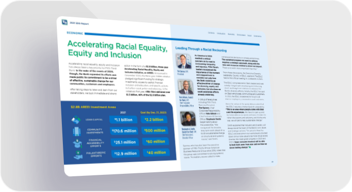 Contents Introduction Economic Environment Social Governance Leading Through a Racial Reckoning 2021 ESG Report ECONOMIC Accelerating Racial Equality, Equity and Inclusion Accelerating racial equality, equity and inclusion action in the form of a $2.8 billion, three-year has always been a key priority for Fifth Third Accelerating Racial Equality, Equity and Bank. In the wake of the events of 2020, Inclusion initiative, or AREEI. Announced in though, the Bank expanded its eforts and December 2020, the three-year ARREI initiative made public its commitment to be a driver pledged signifcant funding for strategic of efective, sustainable change for our investments, access to capital, fnancial communities, customers and employees. inclusion and education, and specifc actions to further social justice and advocacy. In the After taking steps to listen and learn from our initiative’s frst year, Fifth Third delivered over stakeholders, we took immediate and strong $1.3 billion, 46% of the $2.8 billion plan. $ 170.6 million $ 1.1 billion $ 2.2 billion $ 500 million $ 60 million $ 40 million $ 25.1 million $ 12.9 million COMMUNITY INVESTMENTS PHILANTHROPIC EFFORTS LOAN CAPITAL FINANCIAL ACCESSIBILITY EFFORTS $2.8B AREEI Investment Areas 2021 Goal (by Dec. 31, 2023) As America in 2020 reached a critical juncture on its road to overcoming inequality and injustice, Fifth Third’s leaders recognized the importance of the moment and stepped back to consider not only how the Bank could be an efective driver of change for diversity, equity and inclusion, but also how we could accelerate eforts already underway. A group of executives including Fifth Third Bancorp President Tim Spence , Chief Corporate Responsibility Ofcer Kala Gibson and Chief Inclusion & Diversity Ofcer Stephanie Smith began talking about the possibilities. “We recognized the broader, long-term work ahead of us to drive sustainable change on structural and systemic issues,” said Smith. Spence, who has also been the executive sponsor of Fifth Third’s African American Business Resource Group since 2016, noted that the group was committed to solving systemic issues. “As leaders, we are called to make Tim Spence , EVP, President Kala Gibson, Council Co-Chair, E V P, Chief Corporate Responsibility Ofcer Stephanie A. Smith , Council Co-Chair , SVP, Chief Inclusion & Diversity Ofcer consequential decisions in consequential times. The sustained progress we want to achieve requires a strategic approach, along with the time and resources needed to drive real impact. There is no work more important than this.” From these discussions, the Executive Diversity Leadership Council, or EDLC, was born. The EDLC held its frst ofcial meeting on Juneteenth in 2020. The EDLC comprises senior Bank leaders and was initially charged with developing and delivering short- and long-term solutions to advance the Bank’s diversity eforts. Initially, the EDLC focused on Black employees, communities and customers. In 2021, the EDLC broadened its focus to all diverse employees, communities and customers. Given the nature of the work, Gibson noted that the EDLC requires a higher level of vulnerability. “This is an area where people come with their own life experiences. We have to open up and be vulnerable as our work continues. It makes for richer discussions and solutions, and it’s the only way we will get to real, sustainable change.” Smith explained that inclusion and diversity will always be at the heart of the Bank’s core values and strategic actions. “I’m proud of how the EDLC and everyone in our workstreams doubled down on our core value to be more inclusive and diverse. We made great progress in 2020 and 2021. I hope everyone involved will be able to look back years from now and see how we drove lasting change.” 26