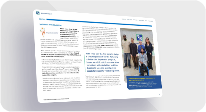 2021 ESG Report SOCIAL Individuals With Disabilities We are proud of our 16-year leadership of Project SEARCH, a school-to-work transition program for high school students with disabilities. The goal of Project SEARCH is to provide students with competitive employment at the end of the one-year program. We were one of the founders of this public-private partnership, which was developed by Cincinnati Children’s Hospital Medical Center and now operates in more than 625 sites worldwide. Fifth Third has operated Project SEARCH programs for 16 years in Cincinnati and 14 years in Grand Rapids, Michigan. Through the end of 2021, we have trained more than 382 individuals; of those, 33 are now Bank employees. Fifth Third recently facilitated a new efort through its partnership with EverFi and ofered our Finance Academy curriculum to over 500 Project SEARCH programs across the world. Project SEARCH’s annual golf outing exceeded expectations and garnered record attendance. The event raised $50,000 through sponsor donations and support from Fifth Third. To date, this event has contributed over $1.6 million to help support the program. Based on needs identifed by our Individuals with Disabilities BRG, Fifth Third ofered a special fnancial education course for teammates who live with or have family members with a disability. The 2021 session focused on helping these families manage everyday expenses, use Fifth Third benefts, make the most of government resources and establish a plan for long - term needs. Fifth Third was the frst bank to design a checking account for the Achieving a Better Life Experience program, known as ABLE. ABLE accounts are state-sponsored saving and investment accounts that allow individuals with disabilities and their families to save and invest private assets for disability-related expenses without losing access to federal-means tested benefts, such as Supplemental Social Security Income, Medicaid, HUD, SNAP and other benefts.* Our ABLE accounts are a result of our work with the National ABLE Alliance, a consortium dedicated to providing those living with disabilities and their families with low- cost investment products. We saw an 87% increase in program participation from 2020 to 2021 , and we expanded the checking product to our Michigan region. Fifth Third was the frst bank to design a checking account for the Achieving a Better Life Experience program, known as ABLE. ABLE accounts allow individuals with disabilities and their families to save and invest private assets for disability-related expenses. To continue our journey to be the leading employer for people with disabilities, Fifth Third in 2021 embarked on developing a neurodiversity hiring program that will launch in 2022. We entered into an agreement with Integrate Autism Employment Advisors for support of this program, which will enable us to hire neurodivergent candidates that will bring unique skills and perspectives to the Bank. Contents Introduction Economic Environment Social Governance Five Project SEARCH employees who celebrated 15 years of employment with us. Pictured, from left to right in the back, are: Collin Biddle , Investor Specialist I, Evan Denenberg , File Document Specialist I, Nathan Michelson , Bankcard Adjustor I, Esther Ahn , General Ofce Clerk II. Sarah Kayes , Receptionist, is in front. *Certain limitations may apply based on applicable state or federal law. 56