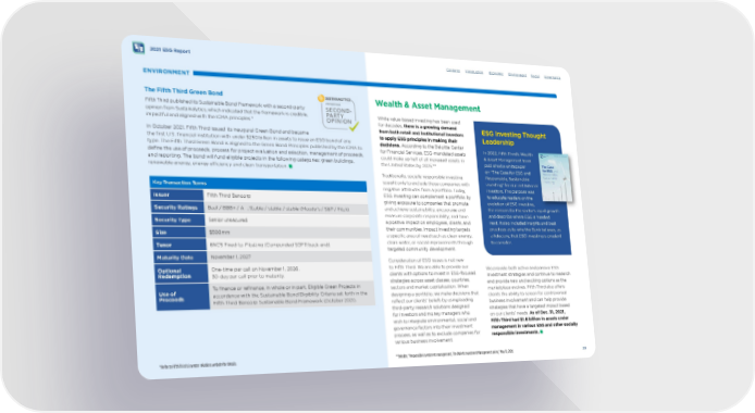 2021 ESG Report ENVIRONMENT The Fifth Third Green Bond Fifth Third published its Sustainable Bond Framework with a second-party opinion from Sustainalytics, which indicated that the framework is credible, impactful and aligned with the ICMA principles.* In October 2021, Fifth Third issued its inaugural Green Bond and became the frst U.S. fnancial institution with under $250 billion in assets to issue an ESG bond of any type. The Fifth Third Green Bond is aligned to the Green Bond Principles published by the ICMA to defne the use of proceeds, process for project evaluation and selection, management of proceeds, and reporting. The bond will fund eligible projects in the following categories: green buildings, renewable energy, energy efciency and clean transportation. Key Transaction Terms Issuer Fifth Third Bancorp Security Ratings Baa1 / BBB+ / A- ; Stable / stable / stable (Moody's / S&P / Fitch) Security Type Senior unsecured Size $500mm Tenor 6NC5 Fixed-to-Floating (Compunded SOFR back-end) Maturity Date November 1, 2027 Optional Redemption One-time par call on November 1, 2026. 30-day par call prior to maturity. To fnance or refnance, in whole or in part, Eligible Green Projects in accordance with the Sustainable Bond Eligibility Criteria set forth in the Fifth Third Bancorp Sustainable Bond Framework (October 2021). Use of Proceeds Contents Introduction Economic Environment Social Governance Wealth & Asset Management While value-based investing has been used for decades, there is a growing demand from both retail and institutional investors to apply ESG principles in making their decisions. According to the Deloitte Center for Financial Services, ESG-mandated assets could make up half of all managed assets in the United States by 2025.** Traditionally, socially responsible investing sought only to exclude those companies with negative attributes from a portfolio. Today, ESG investing can complement a portfolio by giving exposure to companies that promote and achieve sustainability; encourage and measure corporate responsibility; and have a positive impact on employees, clients, and their communities. Impact investing targets a specifc area of need such as clean energy, clean water, or social improvements through targeted community development. Consideration of ESG issues is not new to Fifth Third. We are able to provide our clients with options to invest in ESG-focused strategies across asset classes, countries, sectors and market capitalization. When designing a portfolio, we make decisions that refect our clients’ beliefs by using leading third-party research solutions designed for investors and money managers who wish to integrate environmental, social and governance factors into their investment process, as well as to exclude companies for various business involvement. ESG Investing Thought Leadership In 2022, Fifth Third’s Wealth & Asset Management team published a whitepaper on “The Case for ESG and Responsible, Sustainable Investing” for our institutional investors. The purpose was to educate readers on the evolution of ESG investing, the reasons for the sector’s rapid growth and describe where ESG is headed next. It also included insights and best practices as to why the Bank believes, as a fduciary, that ESG investing is prudent to consider. We provide both active and passive ESG investment strategies and continue to research and provide new and exciting options as the marketplace evolves. Fifth Third also ofers clients the ability to screen for controversial business involvement and can help provide strategies that have a targeted impact based on our clients’ needs. As of Dec. 31, 2021, Fifth Third had $1.8 billion in assets under management in various ESG and other socially responsible investments. **Deloitte, “Responsible investment management, The Dbriefs Investment Management series,” May 13, 2020. *Refer to Fifth Third’s investor relations website for details. 39