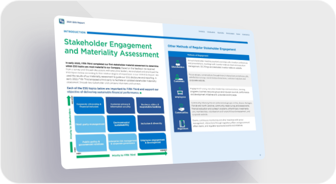 - 2021 ESG Report INTRODUCTION Stakeholder Engagement and Materiality Assessment In early 2020, Fifth Third completed our frst stakeholder material assessment to determine which ESG topics are most material to our Company. Based on the feedback we received from a survey and through discussions with executive leaders, we evaluated and prioritized the ESG topics below according to their relative degree of importance in our 2019 ESG Report. We used the results of our materiality assessment to guide our ESG disclosures and reporting. In early 2022, Fifth Third engaged a third party to facilitate an updated stakeholder materiality assessment through key stakeholder and company interviews and surveys. Each of the ESG topics below are important to Fifth Third and support our objective of delivering sustainable fnancial performance. Priority to Stakeholders HIGH HIGHEST Corporate citizenship & fnancial inclusion Third party management Public policy & government relations Customer privacy & information security Environmental sustainability Enterprise risk management & corporate governance Business ethics & responsible banking Inclusion & diversity Employee engagement & development HIGH HIGHEST Priority to Fifth Third Contents Introduction Economic Environment Social Governance Other Methods of Regular Stakeholder Engagement Methods of Engagement Shareholders Customers Employees Communities Regulators Annual shareholder meeting, quarterly earnings calls, investor conferences and presentations, meetings with investor relations team and executive management, SEC flings and dedicated investor relations website. Focus groups, conversations through branch interactions and phone calls, satisfaction surveys, social media interactions, customer helplines and corporate website. Engagement survey, executive leadership communications, learning programs, business resource groups and inclusion councils, performance and development initiatives and corporate landing page. Community Advisory Forum (national and groups in Ohio, Illinois, Michigan, Florida and North Carolina), community needs survey and assessments, fnancial education and outreach programs, philanthropic investments, civic memberships, volunteerism and nonproft board engagement, and corporate website. Exams, continuous monitoring and other meetings with senior management, interactions through regulatory afairs and government afairs teams, and regulator-sponsored events and initiatives. 12