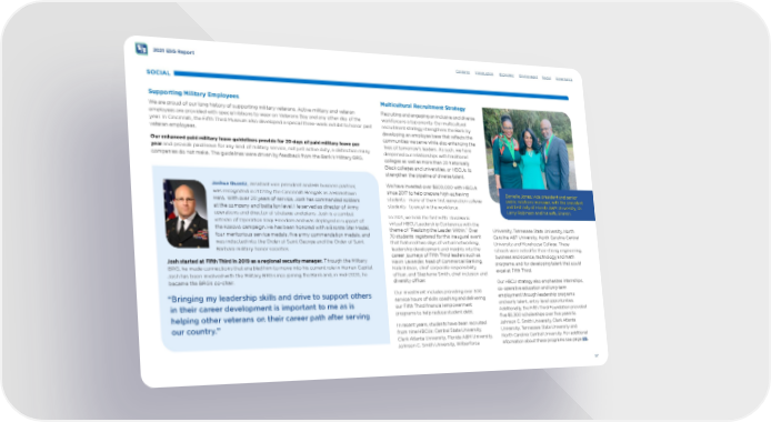 2021 ESG Report SOCIAL Supporting Military Employees We are proud of our long history of supporting military veterans. Active military and veteran employees are provided with special ribbons to wear on Veterans Day and any other day of the year. In Cincinnati, the Fifth Third Museum also developed a special three-week exhibit to honor past veteran employees. Our enhanced paid military leave guidelines provide for 20 days of paid military leave per year and provide paid leave for any kind of military service, not just active duty, a distinction many companies do not make. The guidelines were driven by feedback from the Bank’s Military BRG. Joshua Quantz , assistant vice president and HR business partner, was recognized in 2021 by the Cincinnati Bengals as a Hometown Hero. With over 20 years of service, Josh has commanded soldiers at the company and battalion level. He served as director of Army operations and director of strategy and plans. Josh is a combat veteran of Operation Iraqi Freedom and was deployed in support of the Kosovo campaign. He has been honored with a Bronze Star Medal, four meritorious service medals, fve army commendation medals, and was inducted into the Order of Saint George and the Order of Saint Barbara military honor societies. Josh started at Fifth Third in 2019 as a regional security manager. Through the Military BRG, he made connections that enabled him to move into his current role in Human Capital. Josh has been involved with the Military BRG since joining the Bank and, in mid-2020, he became the BRG’s co-chair. “Bringing my leadership skills and drive to support others in their career development is important to me as is helping other veterans on their career path after serving our country.” Contents Multicultural Recruitment Strategy Recruiting and engaging an inclusive and diverse workforce is a top priority. Our multicultural recruitment strategy strengthens the Bank by developing an employee base that refects the communities we serve while also enhancing the lives of tomorrow’s leaders. As such, we have deepened our relationships with traditional colleges as well as more than 20 historically Black colleges and universities, or HBCUs, to strengthen the pipeline of diverse talent. We have invested over $600,000 with HBCUs since 2017 to help prepare high-achieving students—many of them frst generation college students—to excel in the workforce. In 2021, we held the frst Fifth Third Bank virtual HBCU Leadership Conference with the theme of “Realizing the Leader Within.” Over 70 students registered for this inaugural event that featured two days of virtual networking, leadership development and insights into the career journeys of Fifth Third leaders such as Kevin Lavender, head of Commercial Banking, Kala Gibson, chief corporate responsibility ofcer, and Stephanie Smith, chief inclusion and diversity ofcer. Our investment includes providing over 500 service hours of skills coaching and delivering our Fifth Third fnancial empowerment programs to help reduce student debt. In recent years, students have been recruited from nine HBCUs: Central State University, Clark Atlanta University, Florida A&M University, Johnson C. Smith University, Wilberforce Introduction Economic Environment Social Governance Danielle Jones, vice president and senior public relations manager, with the president and frst lady of Florida A&M University, Dr. Larry Robinson and his wife, Sharon. University, Tennessee State University, North Ca rolina A&T University, North Carolina Central University and Morehouse College. These schools were noted for their strong engineering, business and science, technology and math programs, and for developing talent that could excel at Fifth Third. Our HBCU strategy also emphasizes internships, co-operative education and long-term employment through leadership programs and early talent, entry-level opportunities. Additionally, the Fifth Third Foundation provided fve $5,300 scholarships over fve years to Johnson C. Smith University, Clark Atlanta University, Tennessee State University and North Carolina Central University. For additional information about these programs see page 69 . 57