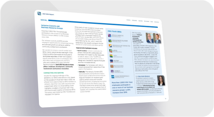 2021 ESG Report SOCIAL Inclusion Councils and Business Resource Groups More than 3,900 Fifth Third employees participate in one or more of our Business Resource Groups (BRGs)—a 20% increase since 2018. Our inclusion councils and BRGs provide employees opportunities for networking, learning and personal growth, as well as an outlet for community outreach and volunteerism. We operate 13 inclusion councils and 65 local BRGs. Senior executives also lead eight virtual Enterprise BRGs that enable all employees to participate regardless of their work location— greatly expanding access for employees with alternative work arrangements and those who work outside of our core Consumer Banking footprint. Each BRG focuses on three pillars: employee development, community involvement and business innovation. CONNECTING AND SERVING Despite the ongoing challenges of the pandemic, our BRGs were active in 2021. Based on the success of virtual town halls in 2020, we ofered more opportunities for BRG members to network, share their voice with executives and support each other in a virtual setting. Event highlights included a virtual town hall in May 2021 that brought together all Enterprise BRGs. The session was hosted by Fifth Third Bancorp President Tim Spence. Other events of note included an inclusion series hosted by Cincinnati BRGs featuring Haben Girma, the frst deaf-blind graduate of Harvard Law School; an Asian American Pacifc Islander Heritage Month virtual event hosted by the Asian & Pacifc Islander BRG, and a joint session of Cincinnati’s Military and African American BRGs featuring Maj. Gen. John C. Harris who talked about race, equality and equity through the lens of current events and military service. Regional BRG highlights included: • North Carolina: To honor Juneteenth, the African American BRG collaborated with Charlotte’s Mint Museum to ofer free access on specifc dates in June. The BRG also commemorated the day with free events in Raleigh and Charlotte for regional employees and their immediate families. • Tennessee: The Tennessee LGBT+ BRG in August sponsored the in-person Boro Pride event in Murfreesboro. • Kentucky: The Kentucky Women’s BRG sponsored events during Women’s History Month and an exhibit at the Frazier Museum. Regional President Kim Haulbauer gave opening remarks along with fve other pioneering women, including the frst woman to row solo across the Atlantic Ocean, the frst Black woman to be named chief judge on the Kentucky Court of Justice’s Court of Appeals, and Louisville’s frst openly lesbian council member. Contents Introduction Economic Environment Social Governance Fifth Third’s BRGs More than 3,900 Fifth Third employees participate in one or more of our business resource groups—a 20% increase since 2018. Fifth Third’s BRGs focus on employee development, community involvement and business innovation . These pillars are exemplifed in the Bank’s BRG leadership. Mitch Morgan (left) is senior manager of inclusion and diversity, and he works collaboratively with Steven Acosta, Fifth Third’s manager of inclusion and diversity, who leads our regional BRG eforts across the footprint. Said Steven, “I joined Fifth Third in 2019 and have been privileged to work with Mitch to lead our BRGs and BRG strategy. Mitch embodies the Bank’s core value of inclusion and diversity and has shown me that having a heart for people and ultimate faith in their abilities can translate into leading innovative programs to drive outcomes and to giving back in meaningful ways to our communities, which is the goal of every BRG at Fifth Third.” For Claire Rubin Ellerhorst , Private Bank investment strategist, volunteering has become an extension of her role as co-chair of the Young Professionals Business Resource Group in Chicago. “Volunteering has been a great way for me to network and connect with my peers . Volunteering my time also supports the broader community and helps me feel more personally connected to it,” Claire said. 55