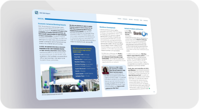 trac ts in 2021: • Southeast Cobb in Georgia. • Cary Park in North Carolina. • Midtown East in North Carolina. • Bayshore Gardens in Florida. • Eastway Crossing serving North Carolina and South Carolina. • Capitol Boulevard in North Carolina. • Duluth in Georgia. • South Square in North Carolina. Gulfgate Plaza in Florida. • Fifth Third opened nine fnancial centers in LMI or high minority 2021 ESG Report SOCIAL Economic Inclusion/Banking Deserts Fifth Third’s Decision Sciences team spent signifcant time identifying banking deserts within our footprint. To address the gaps in the availability of quality fnancial services, we have sought opportunities to open branches in those communities. The Bank’s fnancial empowerment mobile strategy—our eBus and Banking to Go kiosk—help us to provide even greater coverage by taking fnancial services directly into underserved communities. In 2021, we opened nine new, or de novo, branches in low- and moderate-income or high minority population census tracts, representing 30% of our de novo branches we opened last year. As part of Fifth Third’s expansion in the Southeast, we expect about 25% of new branches in that region to be located in those communities. We also are planning to open or update fnancial centers in areas chosen for the Fifth Third Empowering Black Futures neighborhood program. Four de novo branches are planned, four branches will be refreshed to refect our newest design, and one is under consideration and development in conjunction with First Liberty Bank and Trust. For more information about branches in these nine neighborhoods, see page 30 . C ontents Workforce Development A strong workforce is key to healthy, sustainable communities. Fifth Third desires to develop a strong workforce, which is why we collaborate with NextJob, a national reemployment company. Since 2012, we have partnered with NextJob to provide personalized job coaching and training to out-of-work individuals or those looking to advance their careers. We also have ofered the Job Seeker’s Toolkit, a series of online training modules, at no cost to Fifth Third customers. In 2021, Fifth Third and NextJob helped more than 2,000 job seekers. Our Bank also collaborates with Steady , a leading technology platform, to connect our customers to part-time jobs in their communities. We formed this collaboration during the pandemic to facilitate extra income opportunities for our customers. Dorresa is a single mother who was living in a shelter when she was referred to Fifth Third’s NextJob program. Doressa ultimately got two job ofers and accepted a position that is meeting her family’s needs. “I’m overjoyed to be able to provide for my children, to have our own roof...to be free, to be us, to laugh and giggle, and not wonder ‘is the shelter going to kick us out?’. I have fnancial stability now. I have so much gratitude for Fifth Third.” Introduction Economic Environment Social Governance Inclusive Products and Services In 2021, Fifth Third Express Banking® , which has no monthly service charge, balance requirements or overdraft fees, received Bank On certifcation from the Cities for Financial Empowerment Fund. Bank On National Account Standards were developed to ensure expanded access to safe and appropriate fnancial products and services to the nearly 36 million people in the United States outside of the mainstream fnancial system. In addition to the certifcation, Fifth Third supports regional Bank On coalitions to create awareness of Bank On certifed accounts. In 2022, Fifth Third donated to fve regional Bank On coalitions in Atlanta, Chicago, Cleveland, Louisville and Tampa. Together, the organizations provided free volunteer tax preparation to community members. Credit, when used responsibly, can make a real diference. It can enhance a consumer’s chances of acquiring a future loan, including a mortgage to achieve homeownership. The Fifth Third Secured Card * is a credit card designed to help customers build or rebuild their credit. It is a secured card, meaning it is secured by the customer placing a minimum $300 deposit into a new Fifth Third Momentum® account. This deposit funds the account and is used to determine the borrower’s credit limit to help prevent spending beyond the customer’s means. Fifth Third’s Southeast Cobb Financial Center opened in 2021. 78