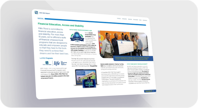 2021 ESG Report SOCIAL Financial Education, Access and Stability Woodcrest Elementary in Columbus, Ohio, was among the schools that received a Fifth Third Young Bankers Club technology grant in 2021. Fifth Third is committed to fnancial education, access and stability. For more than 15 years, we’ve ofered a suite of fnancial empowerment programs that are designed to educate and empower people so that they have to the tools they need to achieve their dreams and live their best lives. L.I.F.E. Programs Fifth Third’s L.I.F.E. (Lives Improved through Financial Empowerment®) programs were designed to educate people at nearly every age and stage of life. Since 2004, Fifth Third has helped educate 2.8 million people in the ways of personal fnance. F IFTH THIRD YOUNG BANKERS CLUB® Nearly 35,000 young bankers have graduated from our signature Fifth Third Young Bankers Club program since 2004. Over 4,500 students participated in 2021, when we launched a digital version of the program to increase its accessibility and provide teachers with greater fexibility. In only 30-45 minutes per week over an eight-week period, teachers can help students learn all the basics of fnance online at any time. The free YBC program features Maximillion Money™, the 10-year-old character featured in all digital lessons. Maximillion takes kids to the New York Stock Exchange, the U.S. Mint and a Fifth Third banking center. The gamifed Contents lessons enable students to “level up” as they learn about budgeting, banking and payment methods, borrowing money, jobs and income, saving and investing, and more. In November 2021, Fifth Third made 13 technology grants of $10,000 each to schools and nonproft organizations that were actively engaging with our new digital Young Bankers Club program. The grants enabled the organizations to purchase and incorporate more tools into their educational curriculums to boost technological access in their communities. Introduction Economic Environment Social Governance FIFTH THIRD BANK FINANCE ACADEMY® We ofer two fnancial education courses for high school students through our Fifth Third Bank Finance Academy program—foundational fnance and entrepreneurship. The program is focused on high-need students and schools, with 51% of students coming from underserved communities. In the 2020-21 school year, 127,173 students completed nearly 300,000 hours of learning. To date, more than 450,000 students have taken Finance Academy courses and completed over one million hours of learning. CONTINUED 76