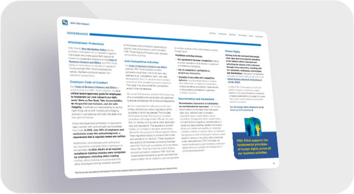 2021 ESG Report GOVERNANCE Whistleblower Protections Fifth Third’s Non-Retaliation Policy strictly prohibits intimidation of, or retaliation against, individuals who make good faith reports of known or suspected violations of the Code of Business Conduct and Ethics , any Fifth Third policy or procedure, or any law or regulation. To ensure that Fifth Third’s practices are robust, the Bank conducts regular non- retaliation assessments. Employee Code of Conduct Our Code of Business Conduct and Ethics is anchored by our Fifth Third Compass, and is a critical Board-approved guide for employees to implement our core values in our daily work: Work as One Bank, Take Accountability, Be Respectful and Inclusive, and Act with Integrity . It outlines our responsibility to do the right thing, serve with honesty and integrity, and act in compliance with both the letter and the spirit of the law. Every employee and contractor is required to read, comply with, and annually acknowledge the Code. In 2021, over 99% of employees and contractors made this acknowledgment, a requirement that is regularly tested and verifed. A dditionally, all employees and contractors are required to complete ethics training on an annual basis. In 2021, 99.9% of all required compliance training modules were completed by employees, including ethics training . Further, ethics training is incorporated into other employee training modules required o f employees and contractors depending on specifc roles and positions within the Bank. Fifth Third’s Board of Directors also receives annual ethics training. Anti-Competitive Activities The Code of Business Conduct and Ethics outlines Fifth Third’s position on anti - competitive activities. Anti-trust laws, also referred to as “competition laws,” are rules developed by the U.S. government to protect consumers from predatory business practices. Their goal is to ensure that fair competition exists in the marketplace. We ensure that business activities that involve any of our competitors are conducted with great care to ensure compliance with all laws and regulations. We are responsible for adherence to the anti- bribery and anti-corruption regulations of the countries in which we operate. This includes the Foreign Corrupt Practices Act, Canada’s Corruption of Foreign Public Ofcials Act, and the U.K. Bribery Act, as well as other applicable laws and regulations. The regulations prohibit bribery of a foreign or domestic government ofcial for the purpose of infuencing that ofcial. These regulations apply to conduct both inside and outside of U.S. territory. These regulations also apply to third parties conducting business with Fifth Third such as suppliers and consultants. While Fifth Third has a low risk of anti-bribery and anti-corruption violations, Fifth Third has implemented standards to govern activities that pose a higher risk of violations, such as payments *Fifth Third Securities representatives licensed through the Financial Industry Regulatory Authority have registered representative agreements that require arbitration of claims. Contents to vendors outside of the United States as well as foreign travel. Prohibited activities include: • Any agreements between competitors relating to prices, allocations of territories or customers or limitations of products. • Use of competitors’ confdential or proprietary information. • Engaging in any other anti-competitive behavior , including disparaging or making false statements in relation to competitors, misappropriating competitors’ trade secrets, or encouraging competitors’ customers to break contracts. Discrimination and Harassment Discrimination, harassment or intimidation are not tolerated for any reason . This includes discrimination on the basis of an individual’s race, color, national origin or ancestry, citizenship status, creed, religion, sexual orientation, transgender status, marital status, civil partnership, pregnancy, parental status or caregiving responsibilities, genetic information, physical or intellectual disability or protected condition, military or veteran status, an individual having been a victim of domestic violence, sexual assault or abuse, or any other status protected under applicable laws. Fifth Third does not require employees to sign mandatory arbitration agreements as a condition of employment or continued employment.* Introduction Economic Environment Social Governance Human Rights Striving to be the one bank that people most value and trust requires operating at the highest ethical standards and upholding the dignity of the individual through every interaction, including with our customers, employees, communities and shareholders . We support fundamental principles of human rights as set forth in the United Nations Universal Declaration of Human Rights . In 2022, Fifth Third signed on to the UN Global Compact, a voluntary initiative based on CEO commitments to implement universal sustainability principles for human rights, labor, environmental sustainability and anti-corruption. Our full human rights statement can be found on ir.53.com/esg . Fifth Third supports the fundamental principles of human rights across all our business activities. 86