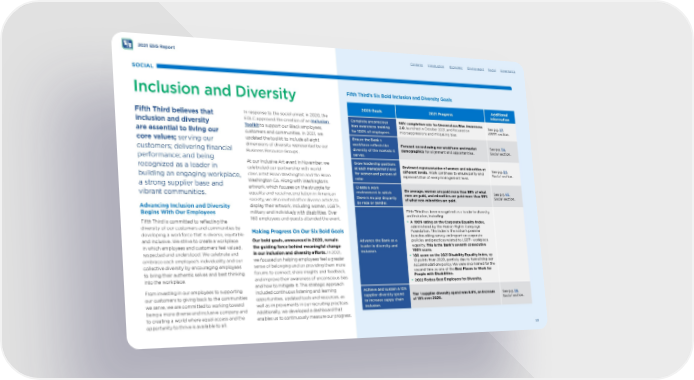 ’ 2021 ESG Report SOCIAL Inclusion and Diversity Fifth Third believes that inclusion and diversity are essential to living our core values; serving our customers; delivering fnancial performance; and being recognized as a leader in building an engaging workplace, a strong supplier base and vibrant communities. Advancing Inclusion and Diversity Begins With Our Employees Fifth Third is committed to refecting the diversity of our customers and communities by developing a workforce that is diverse, equitable and inclusive. We strive to create a workplace in which employees and customers feel valued, respected and understood. We celebrate and embrace each employee’s individuality and our collective diversity by encouraging employees to bring their authentic selves and best thinking into the workplace. From investing in our employees to supporting our customers to giving back to the communities we serve, we are committed to working toward being a more diverse and inclusive company and to creating a world where equal access and the opportunity to thrive is available to all. In response to the social unrest in 2020, the EDLC approved the creation of an Inclusion Toolkit to support our Black employees, customers and communities. In 2021, we updated the toolkit to include all eight dimensions of diversity represented by our Business Resource Groups. At our Inclusive Art event in November, we celebrated our partnership with world- class artist Brian Washington and the Brian Washington Co. Along with Washington’s artwork, which focuses on the struggle for equality and racial reconciliation in American society, we also invited other diverse artists to display their artwork, including women, LGBT+, military and individuals with disabilities. Over 160 employees and guests attended the event. Making Progress On Our Six Bold Goals Our bold goals, announced in 2020, remain the guiding force behind meaningful change in our inclusion and diversity eforts. In 2021, we focused on helping employees feel a greater sense of belonging and on providing them more forums to connect, share insights and feedback, and improve their awareness of unconscious bias and how to mitigate it. This strategic approach included continuous listening and learning opportunities, updated tools and resources, as well as improvements in our recruiting practices. Additionally, we developed a dashboard that enables us to continuously measure our progress. Contents Introduction Economic Environment Social Governance Fifth Third’s Six Bold Inclusion and Diversity Goals 2025 Goals 2021 Progress Additional Information Complete unconscious bias awareness training for 100% of employees. 98% completion rate for Unconscious Bias Awareness 2.0 , launched in October 2021, and focused on microaggressions and mitigating bias. See pg. 27 , AREEI section. Ensure the Bank s workforce refects the diversity of the markets it serves. Focused on reviewing our workforce and market demographics for alignment and opportunities. See pg. 54 , Social section. Grow leadership positions at each management level for women and persons of color. Reviewed representation of women and minorities at diferent levels. Work continues to ensure parity and representation at every management level. On average, women are paid more than 99% of what men are paid, and minorities are paid more than 99% of what non-minorities are paid. Fifth Third has been recognized as a leader in diversity and inclusion, including: • A 100% rating on the Corporate Equality Index, administered by the Human Rights Campaign Foundation. The Index is the nation’s premier benchmarking survey and report on corporate policies and practices related to LGBT+ workplace equality. This is the Bank’s seventh consecutive 100% score. • 100 score on the 2021 Disability Equality Index, up 10 points from 2020, partially due to formalizing our accommodations policy. We were also named for the second time as one of the Best Places to Work for People with Disabilities. • 2022 Forbes Best Employers for Diversity. See pg. 54 , Social section. See pg. 65 , Social section. Create a work environment in which there is no pay disparity by race or gender. Advance the Bank as a leader in diversity and inclusion. Achieve and sustain a 10% supplier diversity spend Tier 1 supplier diversity spend was 8.6%, an increase See pg. 58 , to increase suppy chain inclusion. of 19% over 2020. Social section. 53