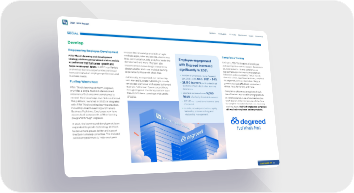 2021 ESG Report SOCIAL Develop Empowering Employee Development Fifth Third’s learning and development strategy delivers personalized and accessible experiences that fuel career growth and helps retain great talent. In 2021, our fexible and virtual learning opportunities continued to evolve based on employee preferences and business needs. Fueling What’s Next Fifth Third’s learning platform, Degreed, provides a single, fuid skill-development experience that empowers employees to expand their knowledge and skills on demand. The platform, launched in 2020, is integrated with Fifth Third’s existing learning providers, including LinkedIn Learning and Harvard Business Publishing. Employees now have access to all components of their learning programs through Degreed. In 2021, the learning and development team expanded Degreed’s technology and tools to serve more groups better and support the Bank’s strategic priorities. This included developing pathways to help employees improve their knowledge and skills on agile methodologies, sales and service, unconscious bias, communication, data analytics, leadership development and more. The team also implemented inclusive design standards to design a better and more inclusive learning experience for those with disabilities. Additionally, we expanded our partnership with Harvard Business Publishing to provide employees at all levels with access to Harvard Business Publishing’s Spark content library through Degreed. The library contains more than 20,000 items covering a wide variety of topics. Contents Introduction Economic Environment Social Governance Employee engagement with Degreed increased signifcantly in 2021. • Number of employees using Degreed: Jan. 2021 – 20%; Dec. 2021 – 94% . • 26,150 learners participated in at least one virtually facilitated learning experience. • Learners consumed over 9,000 hours of virtually facilitated sessions. • 553,538 non-compliance learning items completed • on skills, including innovation, agility, leadership, problem solving and relationship management. Compliance Training Each year, Fifth Third requires all employees and contingent or contract workers to complete courses related to risk and compliance on topics that support strong risk management behaviors and accountability. Topics include fnancial crimes, elder fnancial abuse, complaint management, privacy, information lifecycle governance, code of business conduct and ethics, fraud, fair lending and more. Compliance ofcers and executives of each line of business approve all training specifc to an employee’s role. A set of courses launches each quarter, and employees are allotted time to complete the comprehensive courses during working hours. 99.9% of employees completed all required compliance training modules. CONTINUED 63