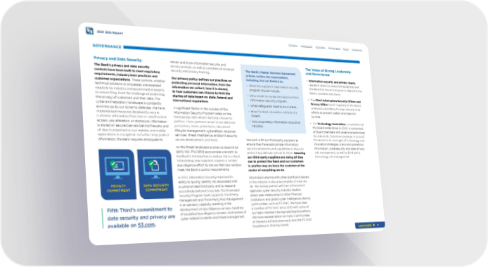 2021 ESG Report GOVERNANCE Privacy and Data Security The Bank’s privacy and data security controls have been built to meet regulatory requirements, industry best practices and customer expectations . These controls, whether technical solutions or processes, are assessed regularly by industry and governmental experts to ensure they meet the challenge of protecting the privacy of customers and their data. The cyber and regulatory landscape is constantly evolving, as do our dynamic defenses. We have implemented measures designed to secure customer information from loss or unauthorized access, use, alteration, or disclosure. Information is stored on secured servers behind frewalls, and all data transported on our website and mobile applications is encrypted. To further help protect information, the Bank requires employees to PRIVACY COMMITMENT DATA SECURITY COMMITMENT Fifth Third’s commitment to data security and privacy are available on 53.com . review and know information security and privacy policies, as well as complete all assigned security and privacy training. Our privacy policy defnes our practices on protecting personal information, from the information we collect, how it is shared, to how customers can choose to limit the sharing of data based on state, federal and international regulations . A signifcant factor in the success of the Information Security Program relies on the third parties with whom we have chosen to partner. These partners assist in our data loss prevention, DDoS protections, document lifecycle management, cyberattack response services, threat intelligence, endpoint security, secure development and more. As the threat landscape evolves so does third- party risk. Providing appropriate oversight to the Bank’s third parties to reduce risk is critical. Onboarding new suppliers requires a vendor due diligence efort to ensure that new vendors meet the Bank’s control requirements. In 2021, Information Security improved its ability to quickly identify risk associated with a compromised third party and to respond accordingly before it’s too late. Our Extended Security Program team supports Third Party Management and Third-Party Risk Management in an advisory capacity, assisting in the development of due diligence surveys, handling of escalated due diligence reviews, and reviews of cyber-related incidents and threat management. Contents The Bank’s Master Services Agreement articles outline the expectations, including, but not limited to: • What the supplier’s information security program should include. • Who needs to review and approve their information security program. • What safeguards need to be in place. • How the Bank should be notifed of a breach. • How proprietary information should be handled. We work with our third-party suppliers to ensure they have appropriate information security programs and capabilities in place to protect any data we entrust to them. Ensuring our third-party suppliers are doing all they can to protect the Bank and our customers is another way we keep the customer at the center of everything we do . Information sharing with other signifcant players in the industry is also a key enabler of what we do. We closely partner with law enforcement agencies, cyber security industry leaders, direct peer relationships in other fnancial institutions and global cyber intelligence sharing communities, such as FS-ISAC. We have been a member of FS-ISAC since 2010 with some of our team members having held Board positions. We have representation on many Communities of Interest and have previously won the FS-ISAC Excellence in Sharing Award. Introduction Economic Environment Social Governance The Value of Strong Leadership and Governance • Information security and privacy teams regularly report to executive leadership and the Board to ensure everyone is aligned to the Bank’s priorities and focus. • The Chief Information Security Ofcer and Privacy Ofce report regularly to the Board or Board committees to keep abreast of all eforts to prevent, detect and respond to risks. • The Technology Committee , a committee of the Board established in 2020, is comprised of Board members with extensive technology backgrounds. Its primary purpose is to assist the Board in its oversight of technology and innovation strategies, plans and operations, information, cybersecurity and data privacy risk management, as well as third-party technology risk management. CONTINUED 91