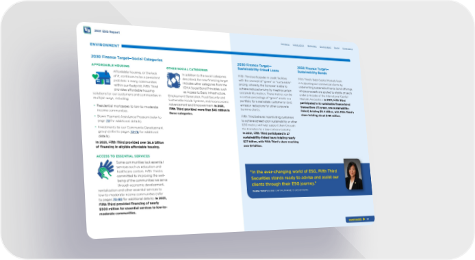 - 2021 ESG Report ENVIRONMENT 2030 Finance Target—Social Categories AFFORDABLE HOUSING Afordable housing, or the lack of it, continues to be a persistent problem in many communities within our footprint. Fifth Third provides afordable housing solutions for our customers and communities in multiple ways, including: • Residential mortgages to low-to-moderate income communities. • Down Payment Assistance Program (refer to page 73 for additional details). • Investments by our Community Development group (refer to pages 73-75 for additional details). In 2021, Fifth Third provided over $6.6 billion of fnancing in eligible afordable housing. ACCESS TO ESSENTIAL SERVICES Some communities lack essential services such as education and healthcare centers. Fifth Third is committed to improving the well - being of the communities we serve through economic development, revitalization and other essential services to low-to-moderate income communities (refer to pages 70-80 for additional details). In 2021, Fifth Third provided fnancing of nearly $500 million for essential services to low-to - moderate communities. OTHER SOCIAL CATEGORIES In addition to the social categories described, the new fnancing target includes other categories from the ICMA Social Bond Principles, such as Access to Basic Infrastructure, Employment Generation, Food Security and Sustainable Foods Systems, and Socieconomic Advancement and Empowerment. In 2021, Fifth Third provided more than $46 million in these categories. Contents 2030 Finance Target— Sustainability-linked Loans Fifth Third participates in credit facilities with the concept of “green” or “sustainable” pricing, whereby the borrower is able to achieve reduced pricing by meeting certain sustainability metrics. These metrics can be a certain percentage of “green” assets in a portfolio for a real estate customer or GHG emission reductions for other corporate banking clients. Fifth Third believes incentivizing customers to achieve agreed upon sustainability or other ESG metrics will help support them through the transition to a low-carbon economy. In 2021, Fifth Third participated in 27 sustainability-linked loans totaling nearly $27 billion, with Fifth Third’s share reaching over $1 billion. Introduction Economic Environment Social Governance 2030 Finance Target— Sustainability Bonds Fifth Third’s Debt Capital Markets team is supporting our commercial clients by underwriting sustainable fnance bond oferings, whose proceeds are applied to eligible projects under principles of the International Capital Markets Association. In 2021, Fifth Third participated in 16 sustainable fnance bond transactions (15 green, one sustainability- linked) totaling $8.4 billion, with Fifth Third’s share totaling about $418 million. “In the ever-changing world of ESG, Fifth Third Securities stands ready to advise and assist our clients through their ESG journey.” MARIA YAMAT, BOND CAPITAL MARKETS GROUP HEAD. CONTINUED 38