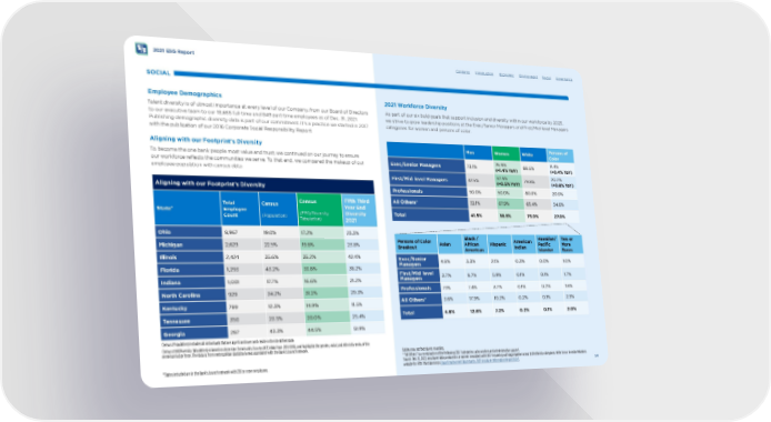 - - 2021 ESG Report SOCIAL Employee Demographics Talent diversity is of utmost importance at every level of our Company, from our Board of Directors to our executive team to our 18,655 full-time and 849 part-time employees as of Dec. 31, 2021. Publishing demographic diversity data is part of our commitment. It’s a practice we started in 2017 with the publication of our 2016 Corporate Social Responsibility Report. Aligning with our Footprint’s Diversity To become the one bank people most value and trust, we continued on our journey to ensure our workforce refects the communities we serve. To that end, we compared the makeup of our employee population with census data. Aligning with our Footprint’s Diversity State* Total Employee Count Census (Population) Census (EEO/Diversity Tabulation) Fifth Third Year End Diversity 2021 Ohio 8,967 19.0% 17. 2 % 23.3% Michigan 2,629 22.5% 19.8% 23.8% Illinois 2,424 35.6% 35.2% 42.4% Florida 1,293 43.2% 33.8% 38.2% Indiana 1,001 17.7 % 16.6% 21.2% North Carolina 929 34.2% 31.2% 29.3% Kentucky 799 12.3% 14.9% 11.5% Tennessee 350 23.5% 20.0% 25.4% Georgia 287 43.3% 44.5% 51.9% Census (Population) includes all individuals that are age 16 and over and reside in the identifed state. Census (EEO/Diversity Tabulation) is based on American Community Survey (ACS) data from 2014-2018, and highlights the gender, racial, and ethnic diversity of the American labor force. The data is from metropolitan statistical areas associated with the Bank’s branch network. *States included are in the Bank’s branch network with 250 or more employees. Contents Introduction Economic Environment Social Governance 2021 Workforce Diversity As part of our six bold goals that support inclusion and diversity within our workforce by 2025, we strive to grow leadership positions at the Exec/Senior Managers and First/Mid-level Managers categories for women and persons of color. 2021 Workforce Diversity Exec/Senior Managers Men Women White Persons of Color 73.1% 26.9% (+1.4% YoY) 88.6% 11.4% (+0.4% YoY) First/Mid level Managers 47. 5% 52.5% (+0. 5% YoY) 79.8% 20.2% (+0. 8% YoY) Professionals 50.0% 50.0% 80.0% 20.0% All Others* 32.1% 67. 9 % 65.4% 34.6% Total 41.5% 58.5% 73.0% 27.0% Persons of Color Breakout Asian Black / African American Hispanic American Indian Hawaiian/ Pacifc Islander Two or More Races Exec/Senior Managers 4.8% 3.3% 2.1% 0.3% 0.0% 1.0% First/Mid level Managers 3.7% 8.7% 5.9% 0.1% 0.1% 1.7% Professionals 7.1% 7. 4% 3.7% 0.1% 0.2% 1.6% All Others* 3.6% 17. 9 % 10.2% 0.2% 0.1% 2.5% Total 4.8% 12.6% 7. 2% 0.2% 0.1% 2.0% Tables may not foot due to rounding. *”All Others” is a combination of the following EEO-1 categories: sales workers and administrative support. Source: Dec. 31, 2021, employee data produced in a manner consistent with EEO-1 reporting with aggregation across EEO1 ethnicity categories. Refer to our Investor Relations website for Fifth Third Bancorp’s Equal Employment Opportunity 2021 Employer Information Report EEO-1 . 54