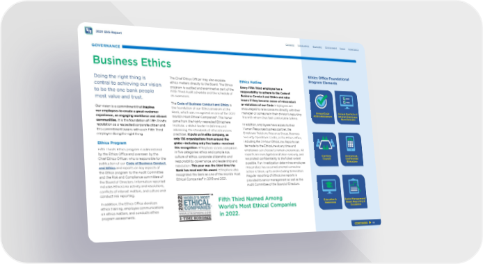 Education & Awareness Anonymous, Confdential EthicsLine Conficts Council Annual Code Acknowledgment Annual Conficts of Interest Disclosure Questionnaire 2021 ESG Report Contents Introduction Economic Environment Social Governance GOVERNANCE Business Ethics Doing the right thing is central to achieving our vision to be the one bank people most value and trust. Our vision is a commitment that inspires our employees to create a great customer experience, an engaging workforce and vibrant communities. It is the foundation of Fifth Third’s reputation as a respected corporate citizen and this commitment begins with each Fifth Third employee doing the right thing. Fift Ethics Program h Third’s Ethics program is administered b y the Ethics Ofce and overseen by the Chief Ethics Ofcer, who is responsible for the publication of our Code of Business Conduct and Ethics and reports on key aspects of the Ethics program to the Audit Committee and the Risk and Compliance committee of the Board of Directors. Information reported includes EthicsLine activity and resolutions, conficts of interest matters, and culture and conduct risk reporting. In addition, the Ethics Ofce develops ethics training, employee communications on ethics matters, and conducts ethics program assessments. The Chief Ethics Ofcer may also escalate ethics matters directly to the Board. The Ethics program is audited and examined as part of the Fifth Third Audit schedule and the schedule of its examiners. The Code of Business Conduct and Ethics is the foundation of our Ethics program at the Bank, which was recognized as one of the 2022 World’s Most Ethical Companies®. This honor came from the highly respected Ethisphere Institute, a global leader in defning and advancing the standards of ethical business practices. It puts us in elite company, as only 136 organizations from around the globe—including only fve banks—received this recognition . Ethisphere scores companies in fve categories: ethics and compliance, culture of ethics, corporate citizenship and responsibility, governance, and leadership and reputation. This year was the third time the Bank has received this award : Ethisphere also recognized the Bank as one of the World’s Most Ethical Companies® in 2019 and 2021. Ethics Hotline Every Fifth Third employee has a responsibility to adhere to the Code of Business Conduct and Ethics and raise issues if they become aware of misconduct or violations of our Code . Employees are encouraged to raise concerns directly with their manager or someone in their division’s reporting line with whom they feel comfortable talking. In addition, employees have access to their Human Resources business partner, the Employee Relations Resource Group, Business Security Operations Center, or the Ethics Ofce, including the 24-hour EthicsLine. Reports can be made to the EthicsLine at any time and employees can choose to remain anonymous. All reports are investigated and taken seriously, and we protect confdentiality to the fullest extent possible. If an investigation determines employee misconduct has occurred, prompt corrective action is taken, up to and including termination. Regular reporting of EthicsLine reports is provided to senior management as well as the Audit Committee of the Board of Directors. Fifth Third Named Among World’s Most Ethical Companies in 2022. Ethics Ofce Foundational Program Elements Senior Management/ Board Reporting & Escalation CONTINUED 85