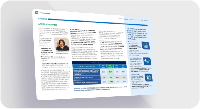 2021 ESG Report ECONOMIC AREEI: Customers Fifth Third seeks to be the bank of choice for Black business owners and Black consumers across our footprint. Our fnancial pledge of $2.8 billion focuses on creating equitable outcomes for all. This workstream, led by Navia McCloud , Business Banking national sales manager, focuses on: • Addressing the racial wealth gap and other fnancial disparities. • Developing end-to-end products and solutions with targeted marketing and outreach. • Listening and learning from customers to achieve our lending commitments in home mortgage, small business and business banking. In addition to focusing on the lending commitment, the group enlisted the services of a majority owned qualitative research frm and an African American focus group moderator to develop a cohesive lifecycle banking education program. The focus groups provided insights on workforce diversifcation, multicultural marketing, the Lifecycle Banking Education Program and Home Mortgage Disclosure Act data, and metropolitan area and census tract level analysis within Fifth Third’s footprint. Navia McCloud , SVP, Business Banking National Sales Manager In 2021, Fifth Third joined the Ofce of the Comptroller of the Currency’s Project REACh initiative. Project REACh (Roundtable for Economic Access and Change) is a collaborative efort that involves leaders from banking, business, technology, and national civil rights organizations to remove structural barriers to fnancial inclusion and increase broader participation in the national economy. Project REACh aims to achieve several changes nationwide that promote fnancial empowerment. The strategy also will implement successful local projects that can serve as models for fnancial inclusion, building wealth and addressing issues of fnancial inequality in areas such as credit alternatives, afordable Contents housing, small business lending and supporting minority depository institutions. Fifth Third has dedicated resources to address these workstreams created by the OCC to drive positive change for its customers. Finally, the customer workstream supported the Fifth Third Empowering Black Futures neighborhood investment program by providing research and data that confrmed the selected areas would receive branch and banking options that meet their specifc needs, including establishing lending goals for each participating neighborhood. Moving forward, the workstream will support the infrastructure of the new branches as well as locations slated for remodeling or other updates. Introduction Economic Environment Social Governance Our customer sub-workstreams play a key role in supporting our Black customers by applying Fifth Third’s One Bank approach with an AREEI focus. Highlights from 2021 include: Mortgage: The sub- stream focused on data driven opportunity assignments to mortgage loan originators engaging real estate agents in target markets and hosted targeted homebuyer education forums in high minority tracts. Small Business Banking, Business Banking and Commercial: This sub- stream adjusted product ofers and bundling based on data discovery results; reviewed credit policies for possible adjustment; and modifed existing One Bank agendas to include AREEI topics. Consumer Retail: This sub-stream aligned education opportunities with Retail branches; considered modifcations to the in-branch customer experience ; and adjusted product oferings and bundling based on data discovery results. AREEI Lending Commitments As of Dec. 31, 2021 (In millions) 2021 Target 2021 Actual 2022 Target 2023 Target Community investments, loans/Financial accessibility, branches in high minority tracts/Contributions via the Fifth Third Foundation $200 $224 $200 $200 Lending to high minority tract businesses $290 $709 $435 $535 Lending to Black homebuyers/owners $270 $469 $315 $365 As of Dec. 31, 2021, Fifth Third had exceeded our AREEI lending commitments to high minority census tract businesses and Black homebuyers. 28