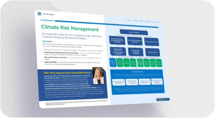 - - - - 2021 ESG Report ENVIRONMENT Climate Risk Management Our organization-wide focus on managing climate-related risks is overseen directly by the Board of Directors. Governance Fifth Third’s Board of Directors is responsible for overseeing corporate governance, strategy and risks, which include risks and opportunities related to climate. In fulflling its responsibilities, the Board has delegated responsibilities to the following committees: • Nominating and Corporate Governance Committee – to monitor and oversee governance matters, including ESG-related commitments, issues and strategies. • Risk and Compliance Committee – to monitor and oversee risks, including those related to climate. • Audit Committee – to monitor and oversee management fnancial statements and audit functions, including climate-related disclosures. Fifth Third Appoints First Climate Risk Ofcer In September 2021, Fifth Third appointed Michele Mullins as the Bank’s frst climate risk ofcer. Creating the role expanded Mullins’ duties as director of enterprise risk governance and business support, and it underscored the Bank’s commitment to managing climate risk. Her responsibilities now include integrating climate risk considerations into Fifth Third’s Risk Management Framework, developing the Bank’s climate risk identifcation and monitoring program, as well as scenario analysis. Mullins partnered with Ceres to lead education sessions that informed our senior management and Board of Directors about the range of climate related disclosures and practices in the industry. Michele has been with the Bank for over 20 years and has served in a variety of management roles in Risk Management and the Commercial line of business. Refer to the Enterprise Risk Management section beginning on page 88 in Governance for further details on Fifth Third’s ERM program and policies and our 2021 TCFD Report for additional details on our climate risk management. Contents Introduction Economic Environment Social Governance Sustainable Finance & Strategy Council Board Risk & Compliance Committee Board Audit Committee Disclosure Council Board of Directors Capital Committee Operational Risk Committee Corporate Credit Committee Management Compliance Committee Loan Loss Reserve Committee Assets & Liabilities Committee Corporate Responsibility & Reputation Committee Board Nominating & Corporate Governance Committee Environmental, Social and Governance (ESG) Committee Enterprise Risk Management Committee Climate Risk Council Climate Risk Council provides updates and recommendations for climate related risk management activities to our Risk Management Committees and Enterprise Risk Management Comittee. Climate Governance Working Group Climate Metrics & Data Working Group Environmental & Social Due Diligence Working Group Climate Scenario Analysis Working Group The Climate Risk Council also partners with sub committees and councils that report into relevant risk management committees to further support establishing climate related risk management activities, such as measurement through scenario anlysis, key risk indicators, concentration limits, etc. CONTINUED 41