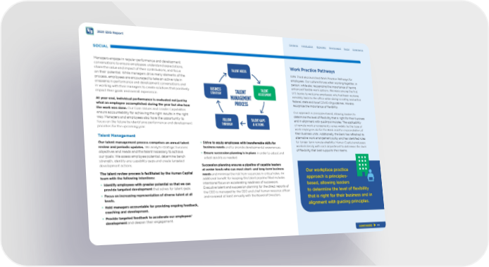 2021 ESG Report SOCIAL Managers engage in regular performance and development conversations to ensure employees understand expectations, share the value and impact of their contributions, and focus on their potential. While managers drive many elements of the process, employees are encouraged to take an active role in engaging in performance and development conversations and in working with their managers to create solutions that positively impact their goals and overall experience. At year-end, individual performance is evaluated not just by what an employee accomplished during the year but also how the work was done. Our Core Values and Leader Capabilities ensure accountability for achieving the right results in the right way. Managers and employees also have the opportunity to focus on the future by identifying performance and development priorities for the upcoming year. Talent Management Our talent management process comprises an annual talent review and periodic updates. We analyze strategic business objectives and needs and the talent necessary to achieve our goals. We assess employee potential, determine bench strength, identify any capability gaps and create targeted development actions. The talent review process is facilitated by the Human Capital team with the following intentions: • Identify employees with greater potential so that we can provide targeted development that solves for talent gaps. • Focus on increasing representation of diverse talent at all levels. • Hold managers accountable for providing ongoing feedback, coaching and development. • Provide targeted feedback to accelerate our employees’ development and deepen their engagement. TALENT NEEDS BUSINESS STRATEGY TALENT MANAGEMENT PROCESS TALENT ASSESSMENT TALENT GAPS & ACTIONS FOLLOW THROUGH • Strive to equip employees with transferrable skills for business needs and to provide developmental experiences. • Ensure succession planning is in place in order to adjust and adapt quickly as needed. Succession planning ensures a pipeline of capable leaders at senior levels who can meet short- and long-term business needs and minimize the risk from vacancies in critical roles. An additional beneft for keeping this talent pipeline flled includes intentional focus on accelerating readiness of successors. Executive talent and succession planning for the direct reports of the CEO is managed by the CEO and chief human resource ofcer and reviewed at least annually with the Board of Directors. Contents Introduction Economic Environment Social Governance Work Practice Pathways Fifth Third also launched Work Practice Pathways for employees. Our culture thrives when working together, in person, while also recognizing the importance of having enhanced fexible work options. We were among the frst U.S. banks to welcome employees who had been working remotely back to the ofce while doing so safely and within federal, state and local COVID-19 guidelines. We also recognize the importance of fexibility. Our approach is principles-based, allowing leaders to determine the level of fexibility that is right for their business and in alignment with guiding principles. The applicability of remote work arrangements varies widely by the type of work employees do for the Bank and the responsibilities of their business units. Additionally, the Bank has refreshed its alternative work arrangement policy and has identifed roles for longer-term remote eligibility. Human Capital employees worked closely with each department to determine the level of fexibility that best supports their teams. Our workplace practice approach is principles- based, allowing leaders to determine the level of fexibility that is right for their business and in alignment with guiding principles. CONTINUED 66
