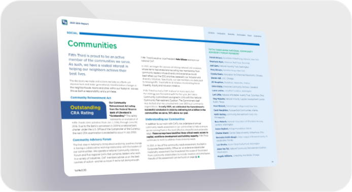 2021 ESG Report Contents Introduction Economic Environment Social Governance SOCIAL Communities Fifth Third is proud to be an active member of the communities we serve. As such, we have a vested interest in helping our neighbors achieve their best lives. The decisions we make and actions we take as a Bank can improve lives and make generational, transformative changes in the neighborhoods, towns and cities within our footprint. We see this as both a responsibility and a privilege. Community Reinvestment Act Outstanding CRA Rating Our Community Reinvestment Act rating from the Federal Reserve Bank of Cleveland is “Outstanding.” This rating represents an evaluation of Fifth Third’s CRA activities from Jan. 1, 2014, through June 30, 2016. Due to the Bank’s conversion in 2019 to a national bank charter under the U.S. Ofce of the Comptroller of the Currency, the next CRA examination is expected to occur in July 2022. Community Advisory Forum The frst step in helping to bring about enduring, positive change is having a collaborative working relationship with the leaders of our communities. We operate a national Community Advisory Forum and fve regional CAFs that comprise leaders who work in a variety of industries. CAF members advise us on the best courses of action—and let us know if we’re not doing enough. Fifth Third Executive Vice President Kala Gibson sponsors our national CAF. In 2021, we began the process of retiring national CAF members whose terms had ended and recruiting new membership from community leaders whose diversity and experience would best refect our fve ESG priorities, especially our inclusion and diversity initiatives. Specifcally, our new members are dedicated to helping Fifth Third fulfll its $2.8 billion Accelerating Racial Equality, Equity and Inclusion initiative. Fifth Third has had a CAF in place for many years, but the strategy was formalized with the fve-year, $32 billion Community Commitment we signed in 2016 with the National Community Reinvestment Coalition. The Commitment itself was drafted after we consulted with over 200 local community organizations. In early 2021, we celebrated the Commitment’s successful conclusion in 2020 by delivering $41.6 billion in the communities we serve, 30% above our goal. Understanding our Communities In addition to our work with CAFs, we undertake an annual community needs assessment in our communities to help us ensure we are serving them in the most efective, impactful and sustainable ways. These surveys have identifed three critical needs: access to capital, workforce development and building capacity. Fifth Third continues its work to address these pressing needs. In 2021, in lieu of the community needs assessment, the Bank’s Corporate Responsibility Ofce ran an extensive stakeholder materiality assessment that broadened the scope of the project from community stakeholders to include investors and employees. Results of the assessment can be found on page 12 . FIFTH THIRD BANK NATIONAL COMMUNITY ADVISORY FORUM MEMBERS* Patrick Briaud, Rockefeller Philanthropy Advisors, New York. Stephanie Byrd, American Red Cross, Cincinnati. Josh Earn, National Housing Trust, Washington. Mary Ehrsam, Operation Hope, New York. Connie Evans, Association for Enterprise Opportunity, Chicago. Steven Hall , LISC, Chicago. Jill Houghton, DisabilityIn, Alexandria, Virginia. Chris Kizzie, Enterprise Community Partners, Cleveland. Laura Levine, Jump$tart Coalition, Washington. Lori Little, National Afordable Housing Trust, Columbus, Ohio. Ying McGuire, National Minority Supplier Development Council, Austin, Texas. Fred Mitchell, United Negro College Fund, New York. Carol Naughton, Purpose Built Communities, Atlanta. Keith Rachey, Community Reinvestment Fund, USA, Minneapolis. Buzz Roberts , National Association of Afordable Housing Lenders, Washington. Aaron Seybert, Kresge Foundation, Detroit. Charles Sharid , Central State University, Wilberforce, Ohio. Germaine Smith-Baugh , Urban League of Broward County, Ft. Lauderdale, Florida. Luz Urrutia, Accion Opportunity Fund, Washington. Jesse Van Tol, National Community Reinvestment Coalition, Washington. Angela Williams, UnitedWay Worldwide, Chicago. *As of May 31, 2022. 70