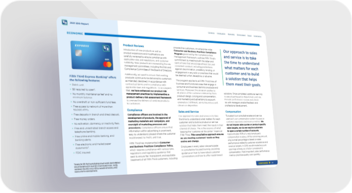 2021 ESG Report Contents Introduction Economic Environment Social Governance ECONOMIC Fifth Third Express Banking® ofers the following features : • Debit card. • $0 required to open*. • No monthly maintenance fee* and no minimum balance. • No overdraft or non-sufcient fund fees. • Free access to network of more than 50,000 ATMs. • Free deposits in branch and direct deposit. • Free money orders. • No activation, dormancy or inactivity fees. • Free and unrestricted branch access and telephone banking. • Free online and mobile banking, and banking alerts. • Free electronic and mailed paper statements*. • FDIC insured. *Denotes the Fifth Third Express Banking account exceeds. Bank On National Account Standards which require $25 or lower deposit to open, monthly maintenance fees of $5 or less or $10 but waivable with activity, and $2 maximum fee for mailed statements. Product Reviews Introduction of new products as well as product expansions and modifcations are carefully reviewed to ensure compliance with applicable rules and regulations, and customer suitability. New products are reviewed by the risk management committees, including the Risk and Compliance Committee of the Board of Directors. Additionally, we want to ensure that existing products continue to be delivered to customers as intended, designed, in accordance with contractual terms and in compliance with applicable laws and regulations. To accomplish that, we have enhanced our product risk management practices by implementing a product delivery risk assessment framework to oversee the delivery of existing products to customers. Compliance Compliance ofcers are involved in the development of products, the approval of marketing materials and campaigns, and oversight of marketing processes and procedures. Compliance ofcers ensure that information within advertising is prominent, easy to understand, placed where the customer would expect to fnd it, and true. Fifth Third has implemented a Consumer and Business Practices Compliance Policy, which requires compliance with various laws, regulations and regulatory guidance that seek to ensure fair, transparent, and equitable treatment of all Fifth Third customers, including prospective customers. An enterprise-wide Consumer and Business Practices Compliance Program governed by the Compliance Risk Management framework, outlines Fifth Third’s commitment to meeting both the letter and spirit of laws that encourage ethical, fair, and consistent conduct, including prohibitions against discrimination, predatory lending, or engagement in any acts or practices that would be deemed unfair, deceptive, or abusive. This program applies to all Fifth Third lines of business and functional areas that engage in consumer and business banking products and services. Moreover, this program applies to all phases of the customer relationship from product design, pricing and compensation, and marketing and advertising to account origination, fulfllment, servicing and account closure or disposition. Sales and Service Our approach to sales and service is to take the time to understand what matters for each customer and to build a product or service solution that helps them meet their goals in their channel of choice. This is the essence of what keeping the “customer at the center” means at Fifth Third. This consultative approach ensures we are meeting customers’ needs as they evolve and change. Employees in every sales role participate in consultative-focused training, providing guidance on how to have robust customer conversations and how to ofer needs-based Our approach to sales and service is to take the time to understand what matters for each customer and to build a solution that helps them meet their goals. solutions. Once completed, additional learning is specialized based on department and role. Periodic performance reviews and check- ins with managers enable feedback and professional development. Compensation To support our consultative sales and service approach, our compensation system focuses on customer experience and revenue metrics. We do not impose sales quotas or product specifc sales targets, nor do we require customers to open a certain number of accounts. Approximately 90% of a retail employee’s compensation is salary. Of the remaining amount, only a small percentage is based on sales performance related to customer experience and revenue targets. In 2019, we eliminated account openings entirely as a factor considered in compensation. Most important, sales performance metrics prioritize quality over quantity. CONTINUED 23