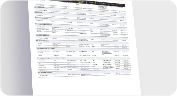 PROUDLY SECOND BEST IKEA CHILDREN FURNITURE DAVID, Madrid / INGO, Hamburg SPAIN SAL GORDA, Madrid / THE LOBBY, Madrid / GRADEPUNK COLOR GRADING, Madrid / WACHO HITS, Buenos Aires SILVER LION SILVER LION THE GHOSTED BAR HEINEKEN HEINEKEN PUBLICIS ITALY | LEPUB, Milan ITALY THE USUAL SUSPECTS, Marietta BRONZE LION BRONZE LION E03 (Screens & Events) THE FIRST DIGITAL NATION THE GOVERNMENT OF TUVALU GOVERNMENT THE MONKEYS, PART OF ACCENTURE SONG, Sydney AUSTRALIA COLLIDER, Sydney BRONZE LION BRONZE LION F01 (Local Brand ) COINCIDENCES QUILMES BEER AB INBEV, Buenos Aires / DRAFTLINE, Buenos Aires ARGENTINA ARGENTINACINE, Buenos Aires BRONZE LION BRONZE LION F02 (Challenger Brand) NORMALIZE IT! OATLY OATLY (OAT DRINK) OATLY, Malmo SWEDEN B-REEL FILMS, Stockholm / PAPAYA FILMS, Warsaw / POM PICTURES, Gothenburg SILVER LION SILVER LION F03 (Single-market Campaign) THE GENTLE GIANT AD COUNCIL, LOVE HAS NO LABELS LOVE HAS NO LABELS R/GA, New York USA SMUGGLER, New York BRONZE LION BRONZE LION BUSCAPÉ. BACK TO THE CITY OF GOD. TELEFÓNICA VIVO & MOTOROLA MOTOROLA EDGE 30 ULTRA 5G VMLY&R, Sao Paulo BRAZIL O2 FILMES, Sao Paulo / SUPERSONICA, Sao Paulo SILVER LION SILVER LION BABY SCAN MARMITE MARMITE adam&eveDDB, London UNITED KINGDOM BISCUIT FILMWORKS, London / WORK EDITORIAL, London / KING HENRY, London BRONZE LION BRONZE LION F04 (Social Behaviour) WELCOME TO NIKE JUKU NIKE JAPAN NIKE JUKU AOI PRO. INC., Tokyo / WIEDEN+KENNEDY, Tokyo JAPAN AOI PRO. INC., Tokyo SILVER LION SILVER LION F05 (Cultural Insight) THE MYTH WIEDEN+KENNEDY PORTLAND PSA WIEDEN+KENNEDY, Portland USA BISCUIT FILMWORKS, Los Angeles SILVER LION SILVER LION SHOUT TELEFÓNICA MOVISTAR VMLY&R MEXICO, Mexico City MEXICO REBOLUCION, Mexico City BRONZE LION BRONZE LION F06 (Breakthrough on a Budget) BLOCKBUSTER: UNTIL THE BITTER END BLOCKBUSTER BLOCKBUSTER VIDEO ATLANTIC, New York USA HAVING CHANGED PRODUCTION, New York / DWECK PRODUCTIONS, New York BRONZE LION BRONZE LION ESCAPE GERMAN RAIL GERMAN RAIL OGILVY GERMANY, Frankfurt GERMANY BRONZE LION BRONZE LION F07 (Corporate Purpose & Social Responsibility) THE GREATEST APPLE APPLE - ACCESSIBILITY APPLE, Cupertino USA SOMESUCH, Los Angeles BRONZE LION BRONZE LION SHE J&B J&B RARE EL RUSO DE ROCKY, Madrid SPAIN AGOSTO, Barcelona BRONZE LION BRONZE LION IRAN-E MAN PAIRI DAEZA PAIRI DAEZA SCARVES NEW-LAND, Copenhagen DENMARK NEW-LAND, Copenhagen BRONZE LION BRONZE LION EVS ON SCREEN GENERAL MOTORS, NETFLIX GENERAL MOTORS, NETFLIX THE COMMUNITY, Miami USA O POSITIVE, Santa Monica / EYELINE STUDIOS, Los Angeles SILVER LION SILVER LION THE LAST PHOTO ITV X CALM ITV X CALM adam&eveDDB, London UNITED KINGDOM CAIN & ABEL, London GRAND PRIX GRAND PRIX F08 (Market Disruption) THE CHEAP DRIVER ST1 UNMANNED FILLING STATIONS GARBERGS KOMMUNIKATION, Stockholm SWEDEN BLECK, Stockholm SILVER LION SILVER LION Title Brand Product / Service Entrant / Idea Creation Location Production Prize Award