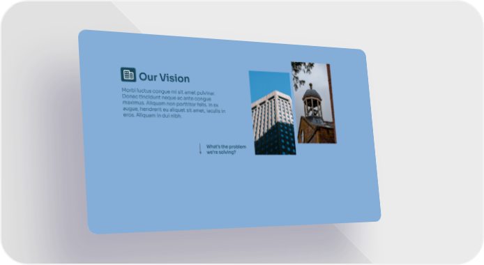 Our Vision Morbi luctus congue mi sit amet pulvinar. Donec tincidunt neque ac ante congue maximus. Aliquam non porttitor felis. In ex augue, hendrerit eu aliquet sit amet, iaculis in eros. Aliquam in dui nibh. What’s the problem we’re solving?